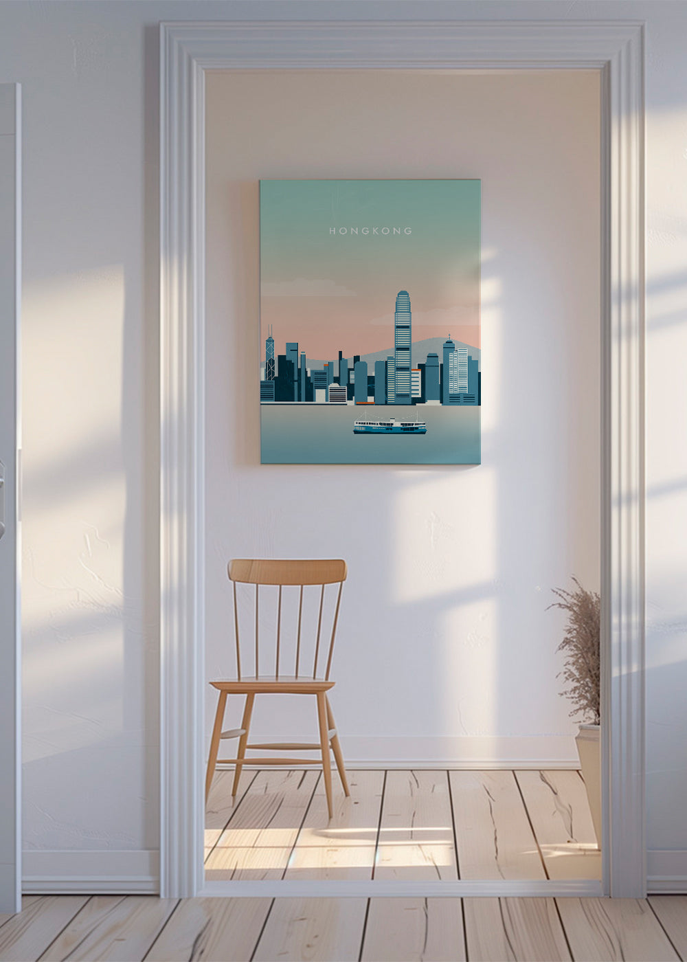 Jolie pièce de notre répertoire tableaux de voyage, conçue par Katinka Reinke, avec des nuances bleus, et pour mettre en orientation portrait. Combinez les skylines, photos et autres cartes des villes pour créer une composition adaptée aux voyageurs. Créez l'environnement parfait.