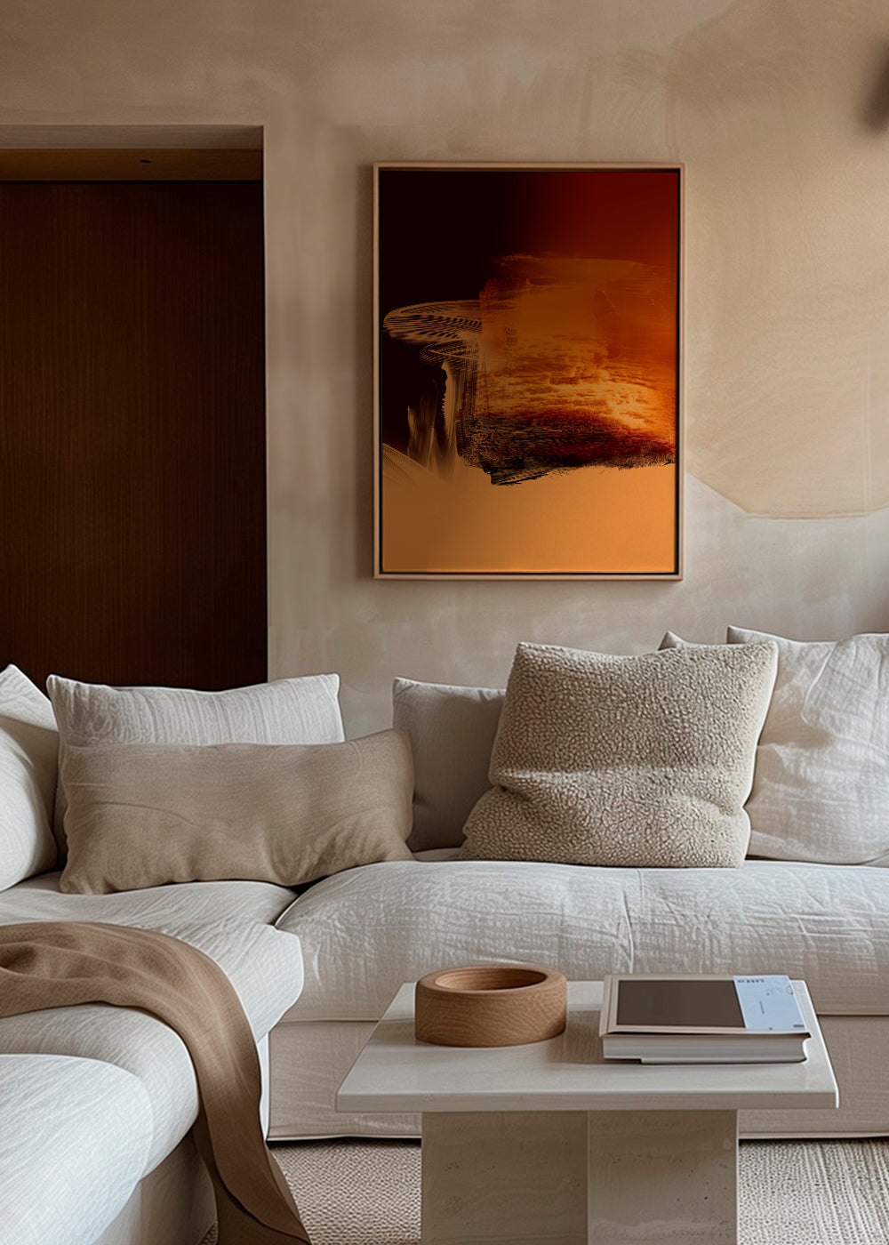Un affiche de notre ensemble tableaux abstraits, de l'artiste Michael Hunter, avec des touches rouges, et à mettre en portrait. Les toiles et affiches d'art abstrait renforcent l'unicité des espaces. Les murs décorés avec des tableaux sont un must