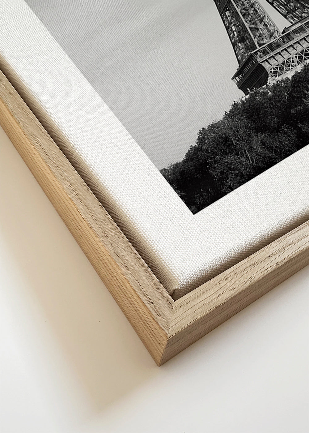 Si vous sélectionnez l'option passe-partout, nous ajouterons le tableau blanc mat au cadre, et nous réduirons le dessin de l'œuvre. Par exemple, si vous sélectionnez un tirage au format 50x70 cm, avec un cadre et un passe-partout couleur chêne, nous réduirons le dessin du tirage au format précédent (40x50cm). Ainsi, il s'adaptera parfaitement à la fenêtre intérieure du passe-partout.