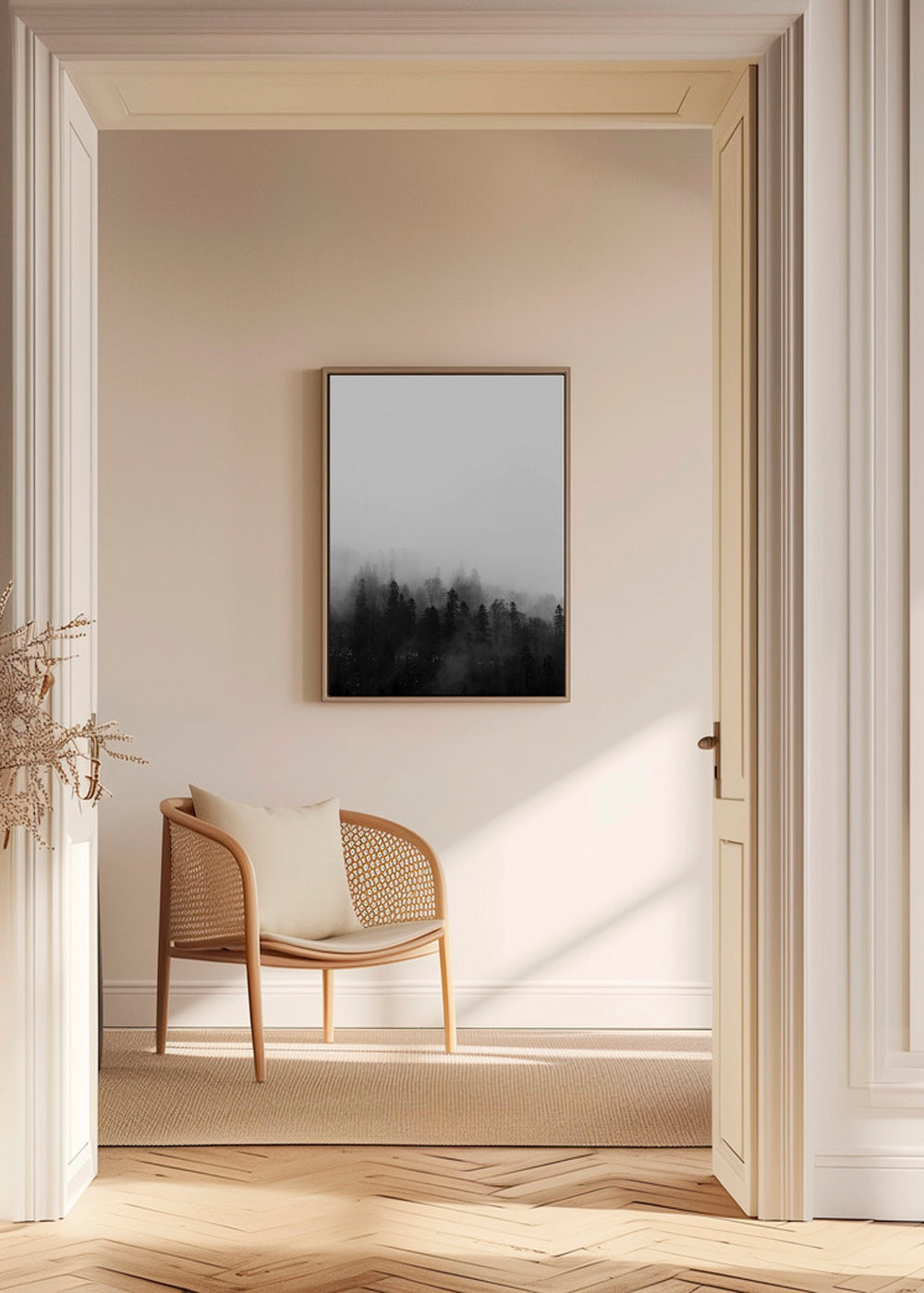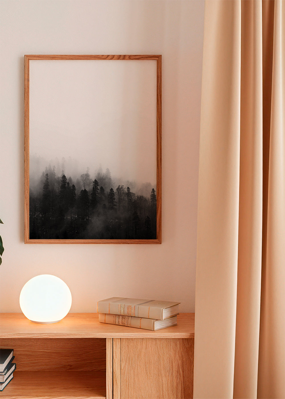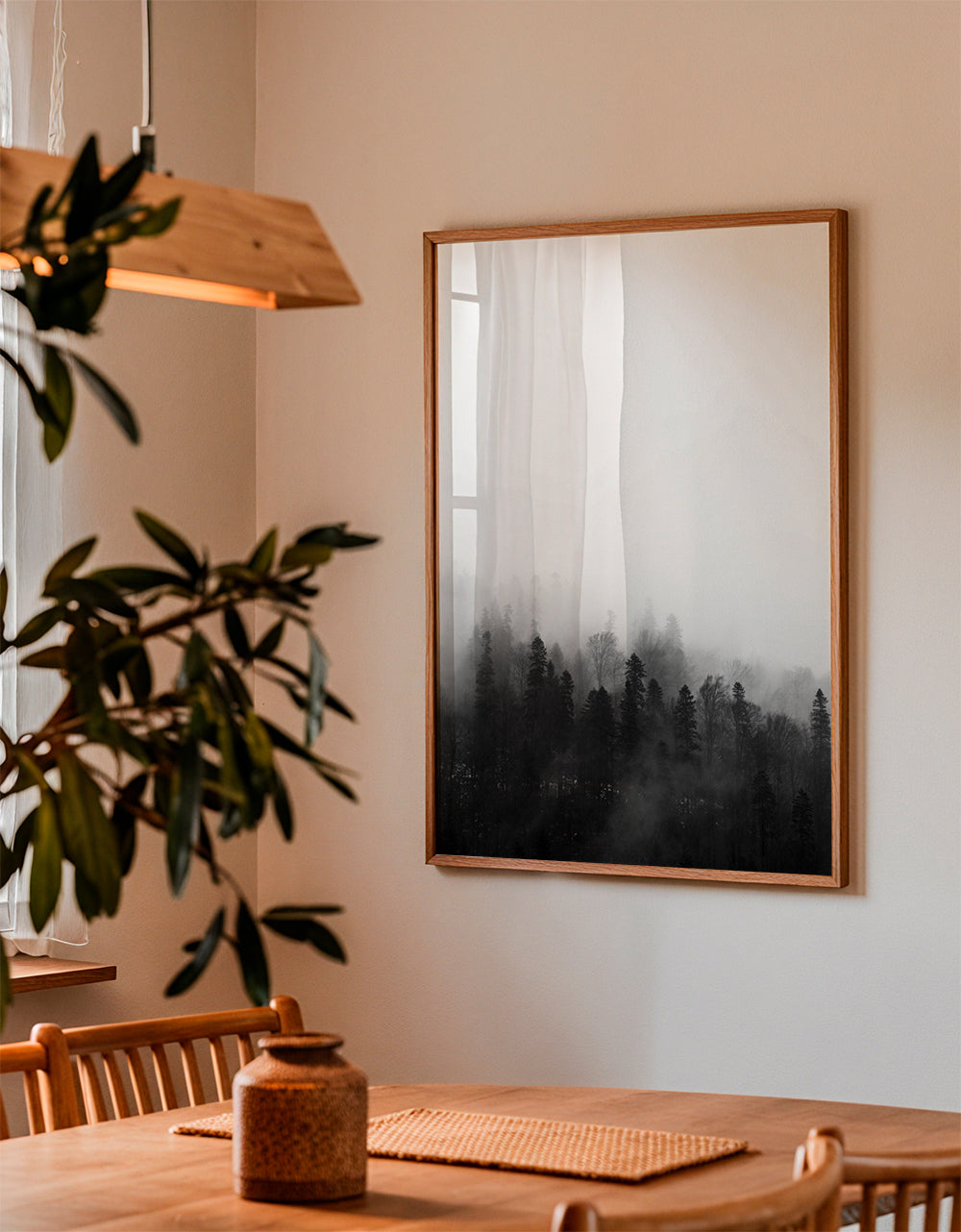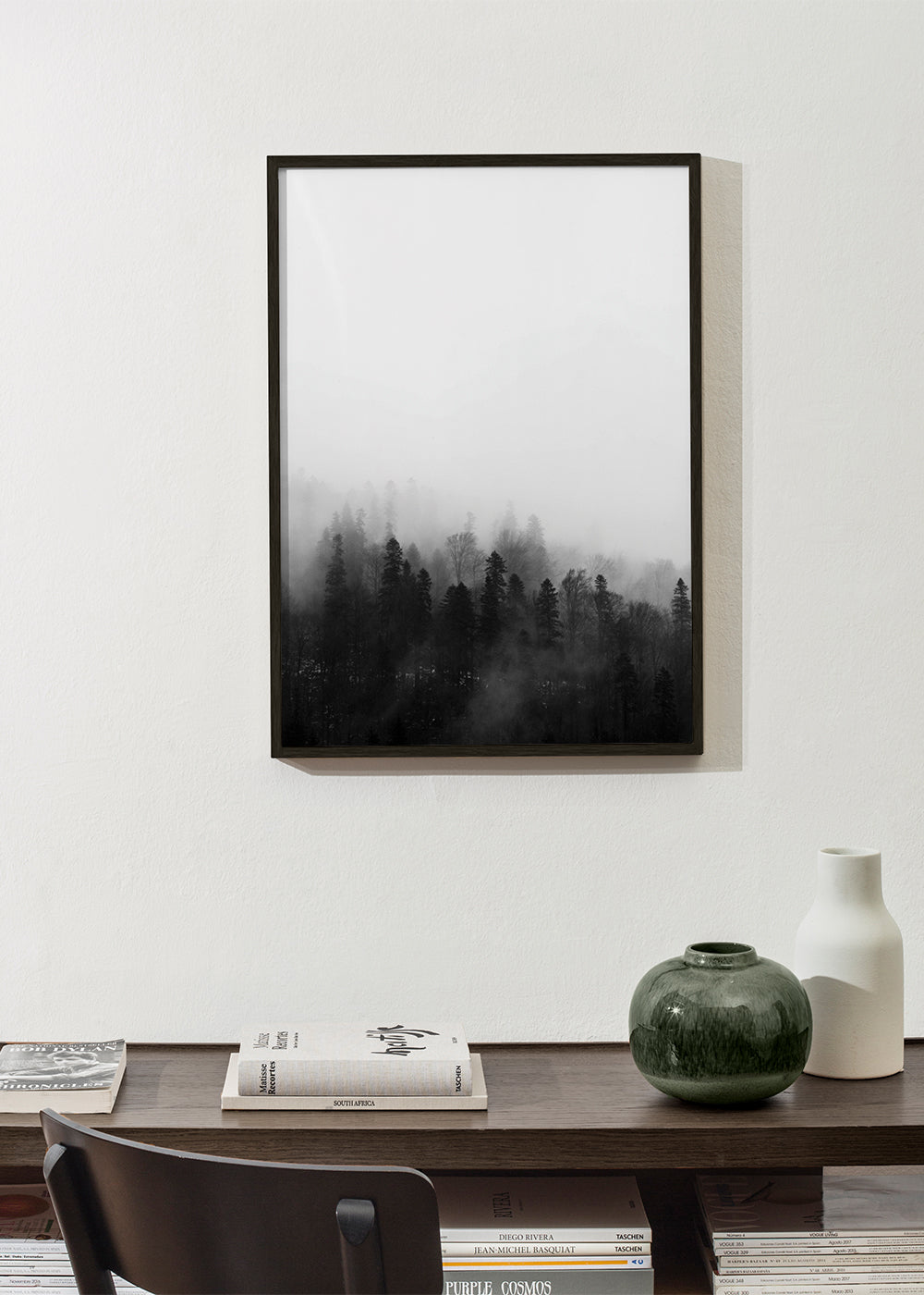 Beau poster de notre ensemble tableaux forêt, de la collection avec pigments gris, et dans une orientation portrait. Un jolie paysage idéal à combiner avec d'autres tableaux de la nature . Créez une décoration murale parfaite.