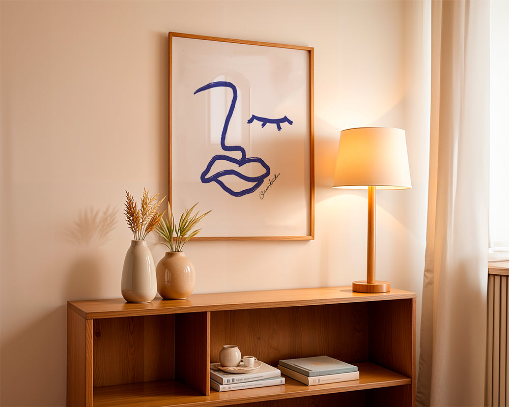 Une image de notre ensemble tableaux minimalistes et contemporains, de la collection de l'artiste 1x, en couleurs bleus, et en position portrait. Avec un design style nordique , cette œuvre s'intègre parfaitement dans une décoration moderne. Il n'y a pas de murs laids ou jolis, il y a des murs vides ou décorés.