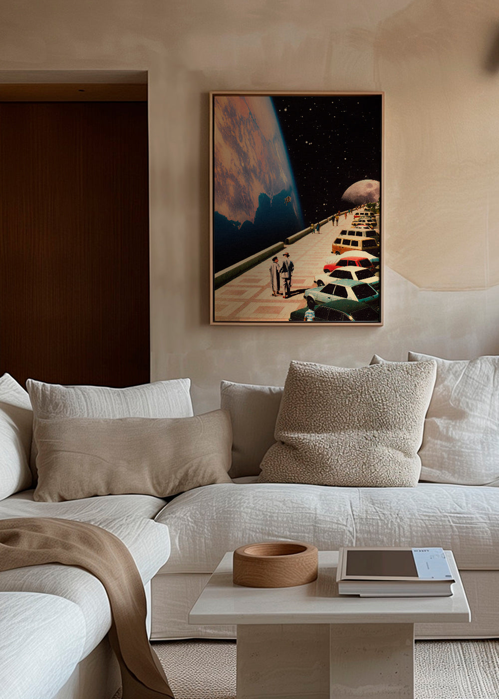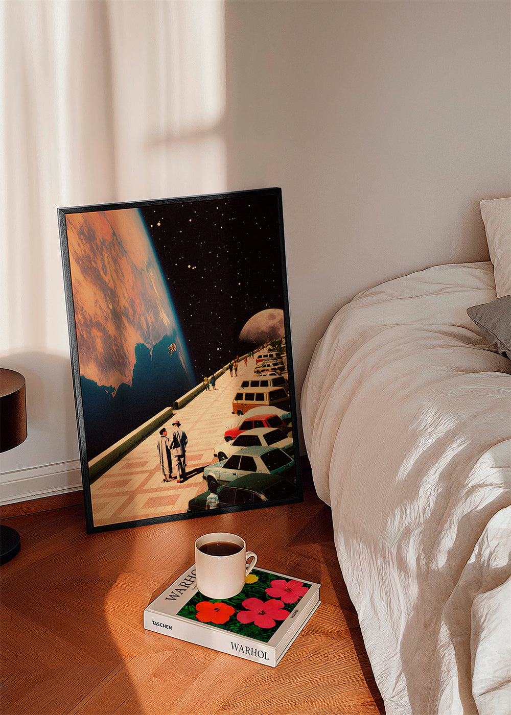 Le passe-partout est un panneau blanc mat qui entoure l'affiche pour la protéger du méthacrylate, et qui améliore également l'expressivité de l'œuvre et met en valeur ses détails.