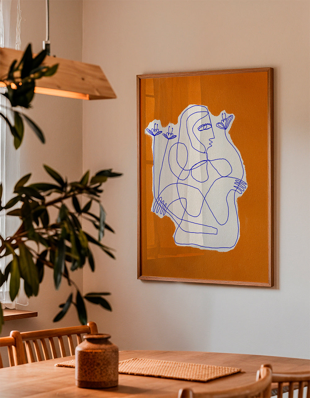 Personnages avec histoire. Dessin charmant Conçu par Shatha Dafai. Composition vibrante de oranges réalisé en orientation verticale. Les tableaux avec illustrations donnent une touche originale à la décoration de la maison. Transformez vos murs ennuyeux