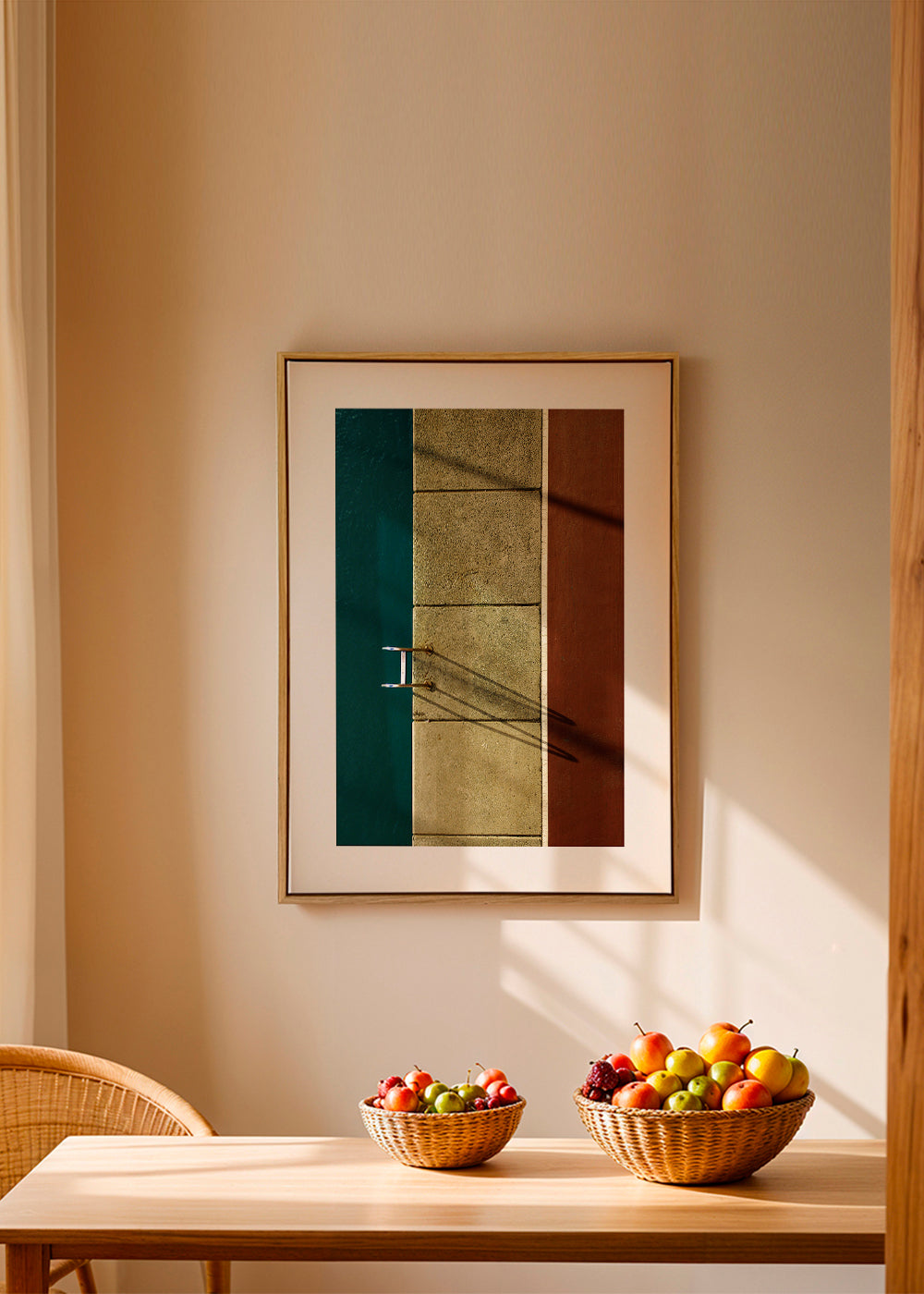 Si vous sélectionnez l'option passe-partout, nous ajouterons le tableau blanc mat au cadre, et nous réduirons le dessin de l'œuvre. Par exemple, si vous sélectionnez un tirage au format 50x70 cm, avec un cadre et un passe-partout couleur chêne, nous réduirons le dessin du tirage au format précédent (40x50cm). Ainsi, il s'adaptera parfaitement à la fenêtre intérieure du passe-partout.
