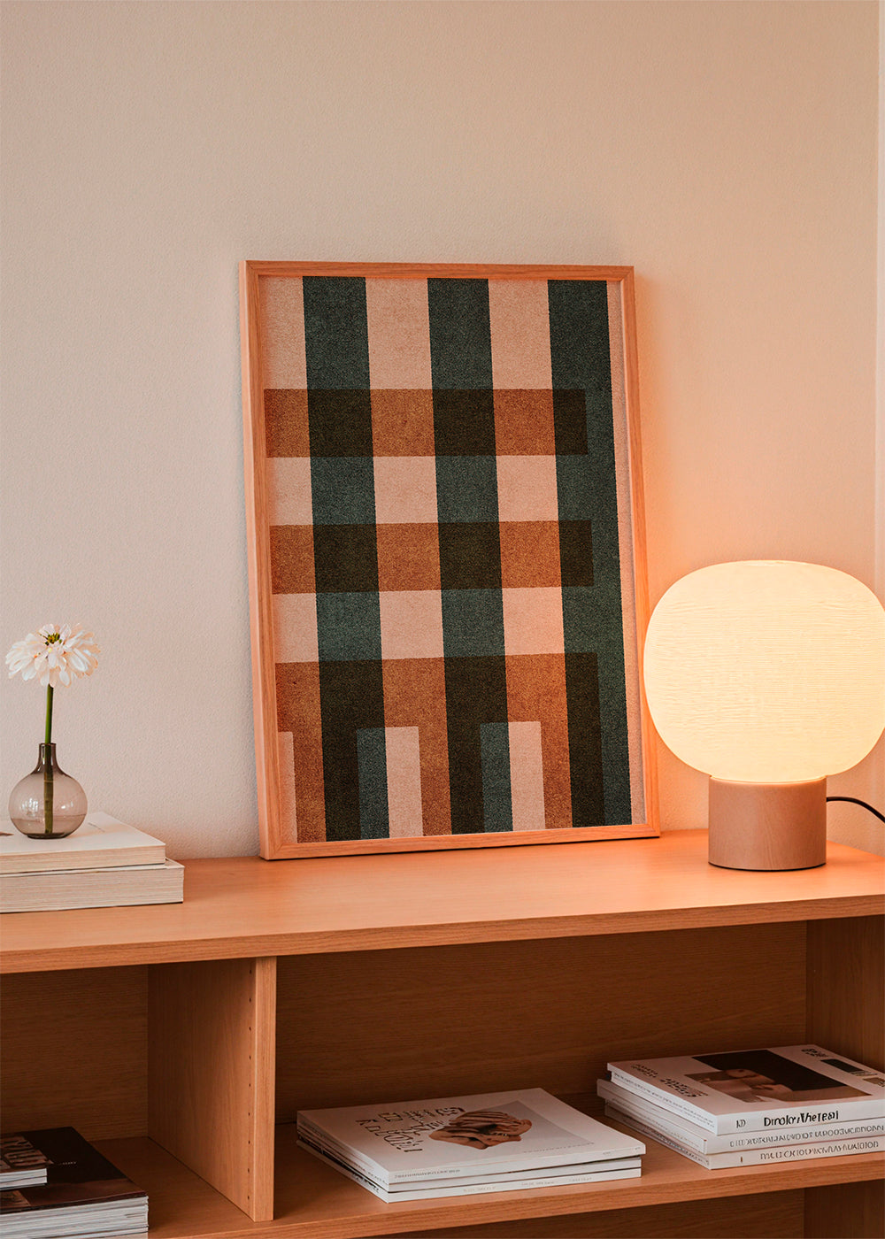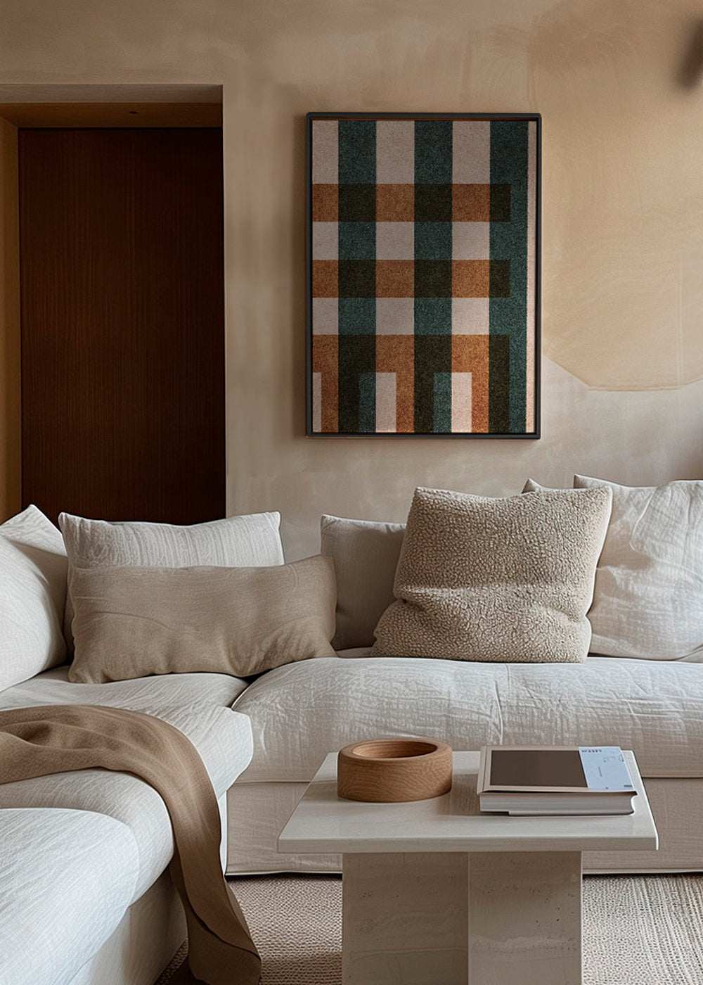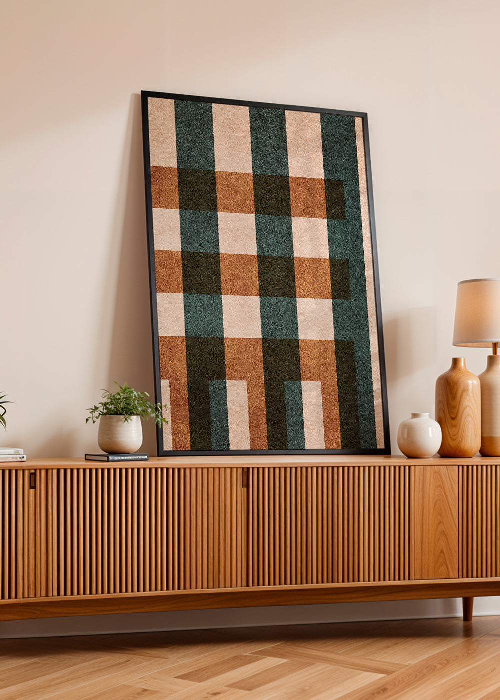 Un poster de notre ensemble tableaux géométrique, conçue par Daniel Coulmann, avec des touches verts, et en position portrait. Les formes géométriques et abstraites contribuent à créer une atmosphère légère et créative. Il n'y a pas de murs laids ou jolis, il y a des murs vides ou décorés.
