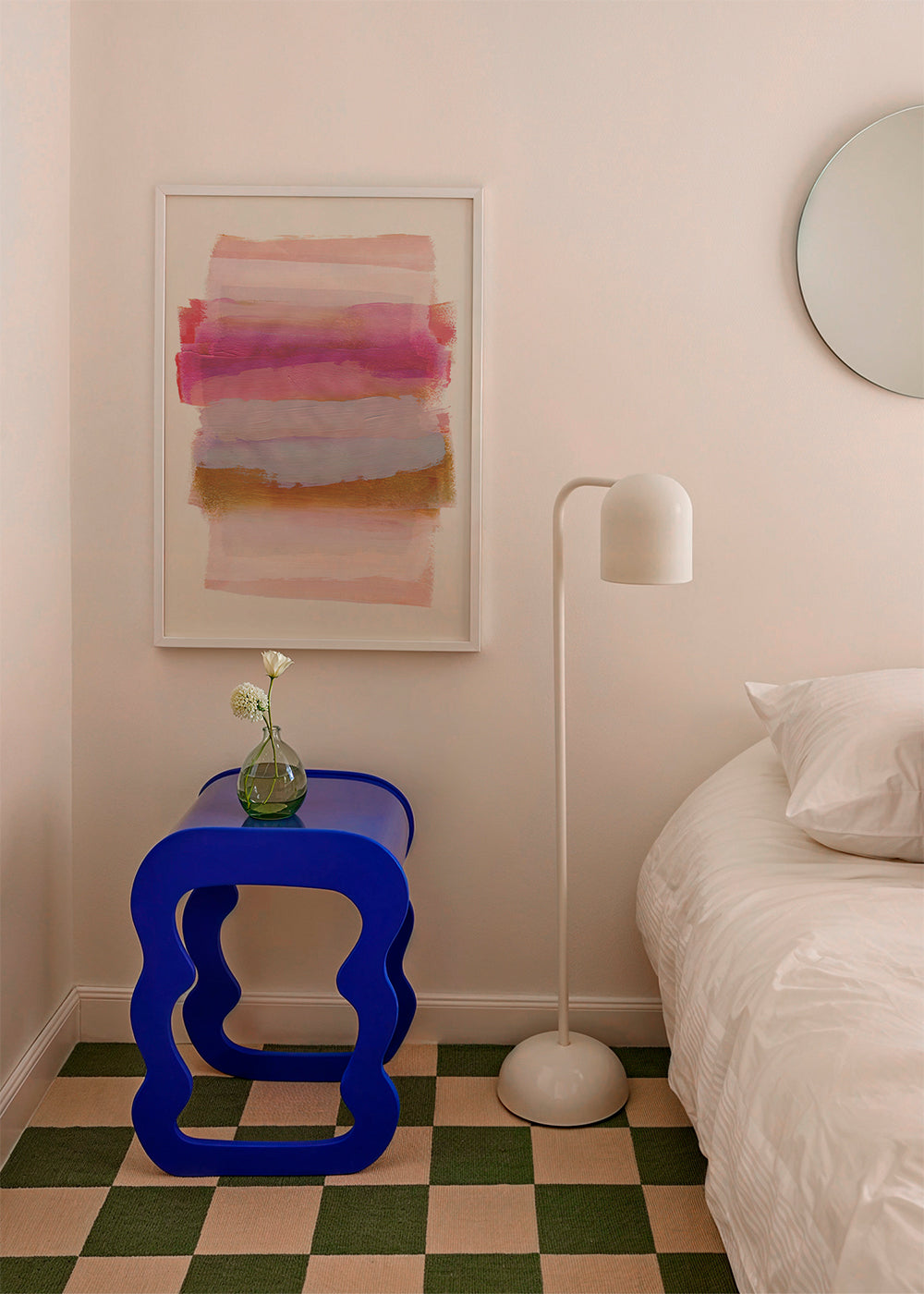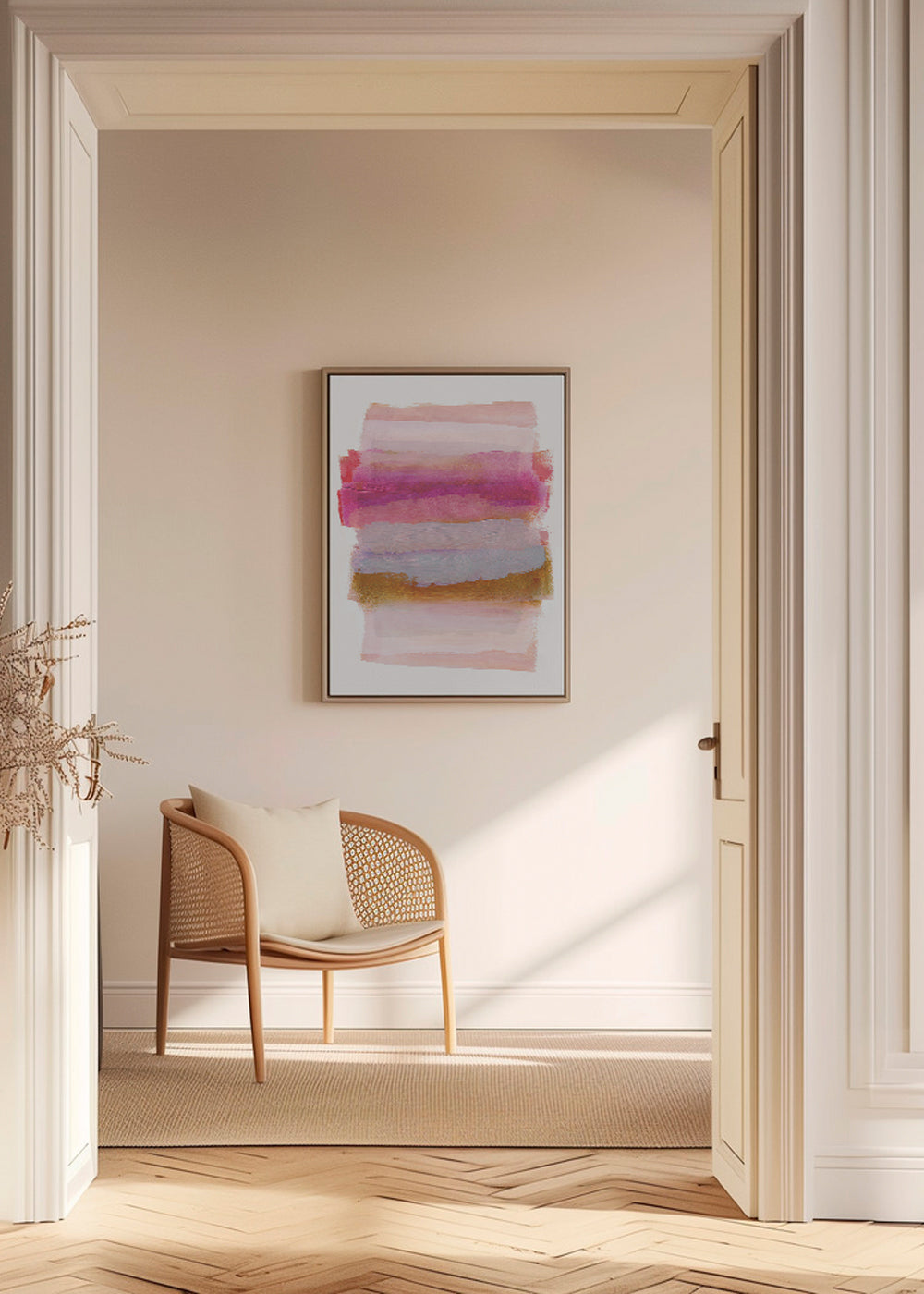 Un affiche avec l'inspiration dans la collection tableaux aux pinceaux, de la collection de l'artiste Mareike Bohmer, avec des nuances de tons roses, et en position portrait. L’ art abstrait réveille nos esprits et nous fait réfléchir sur le sens des œuvres. Oubliez les murs ennuyeux et fades.