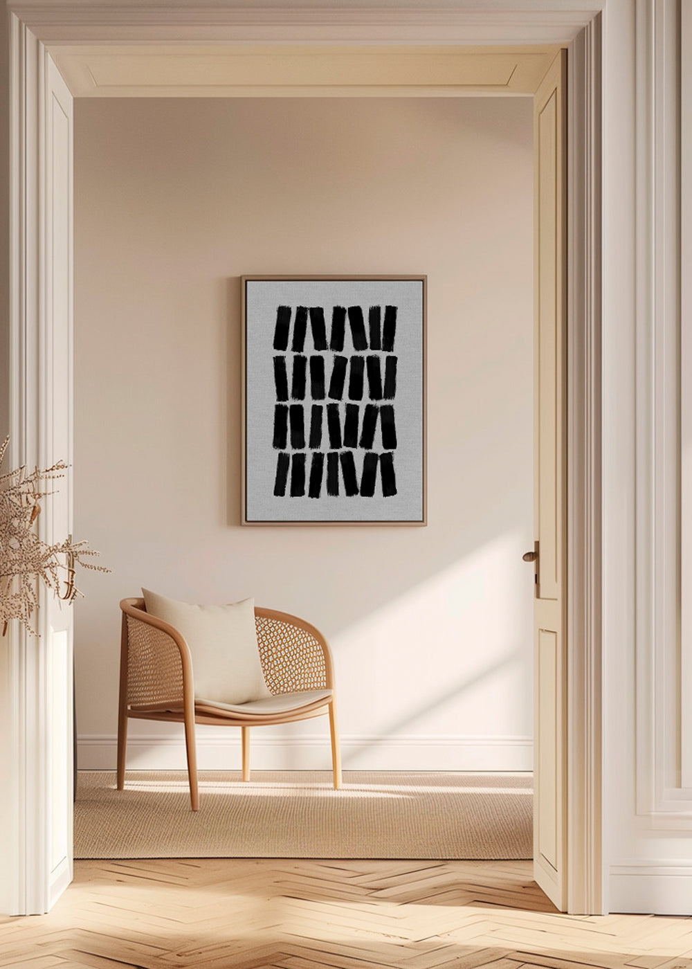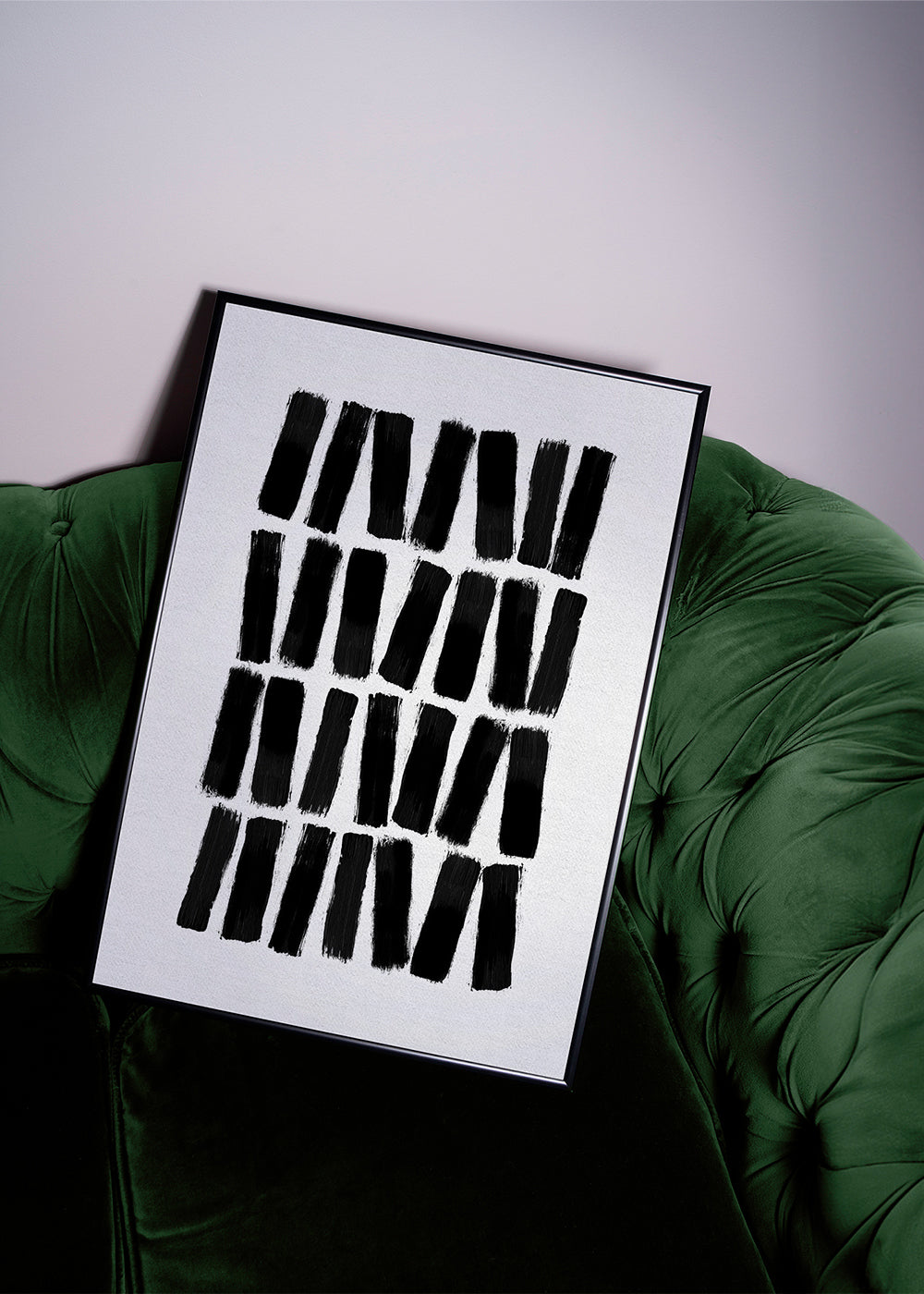 Beau modèle de la série tableaux avec motifs rayures, de la collection de l'artiste Orara Studio, en couleurs gris, et dans une orientation vers un portrait. Les formes géométriques et abstraites contribuent à créer une atmosphère légère et créative. Libérez votre esprit créatif et décorez vos murs avec de l'art.
