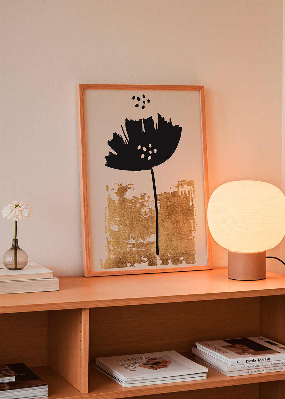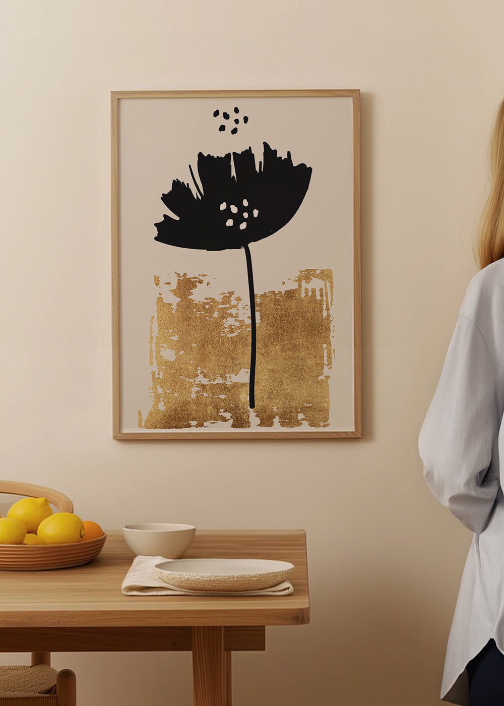 Un poster appartenant à la catégorie affiches feuille, original de KUBISTIKA, avec pigments dorés, et pour mettre en position portrait. Ce tableau botanique est parfait pour une décoration pleine de nature. Des murs élégants pour des maisons chics.
