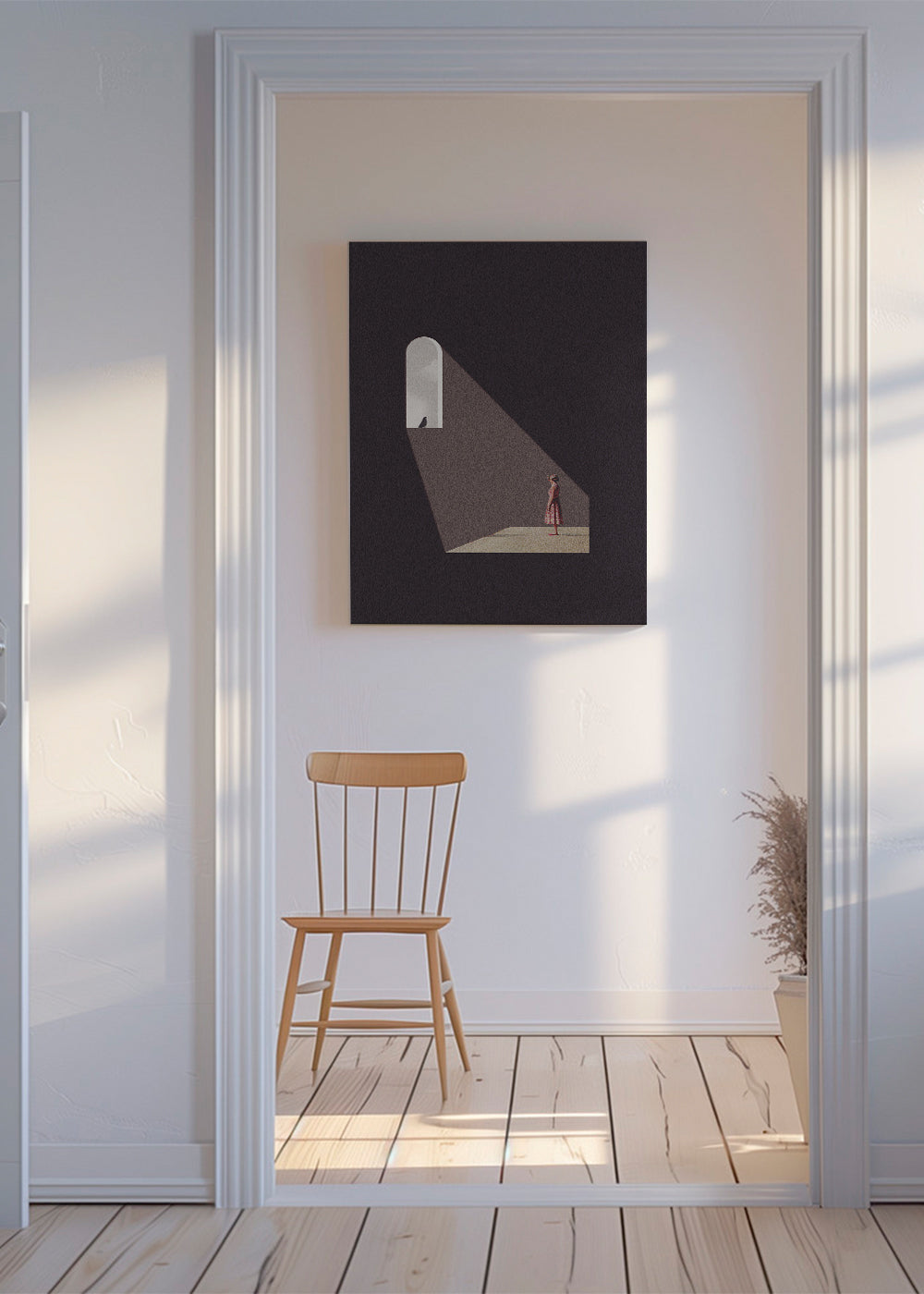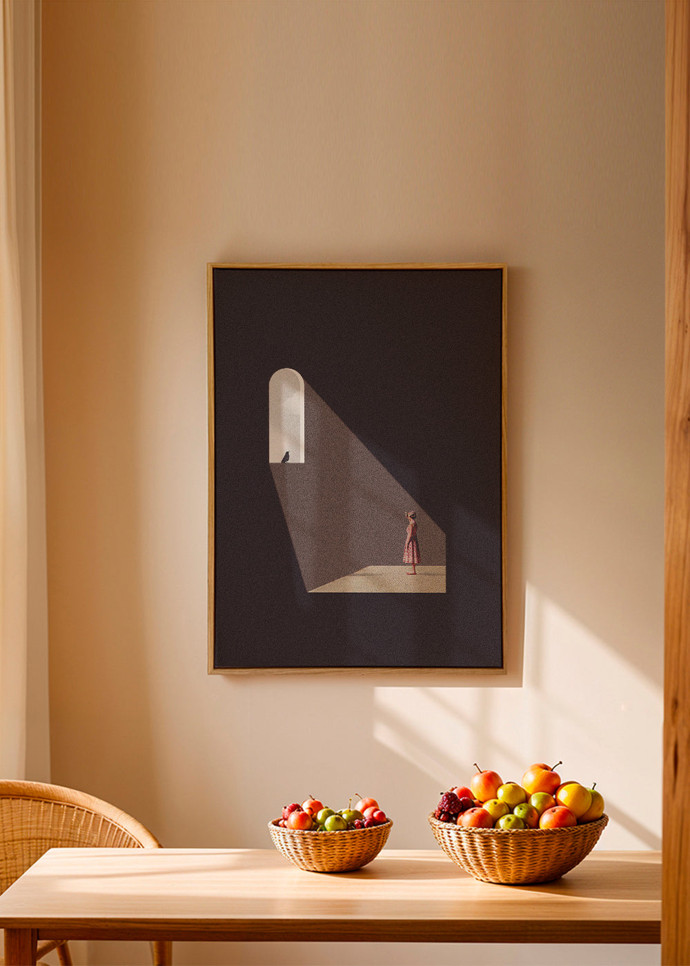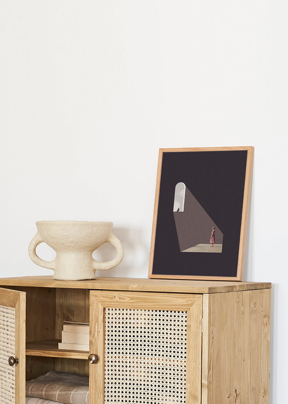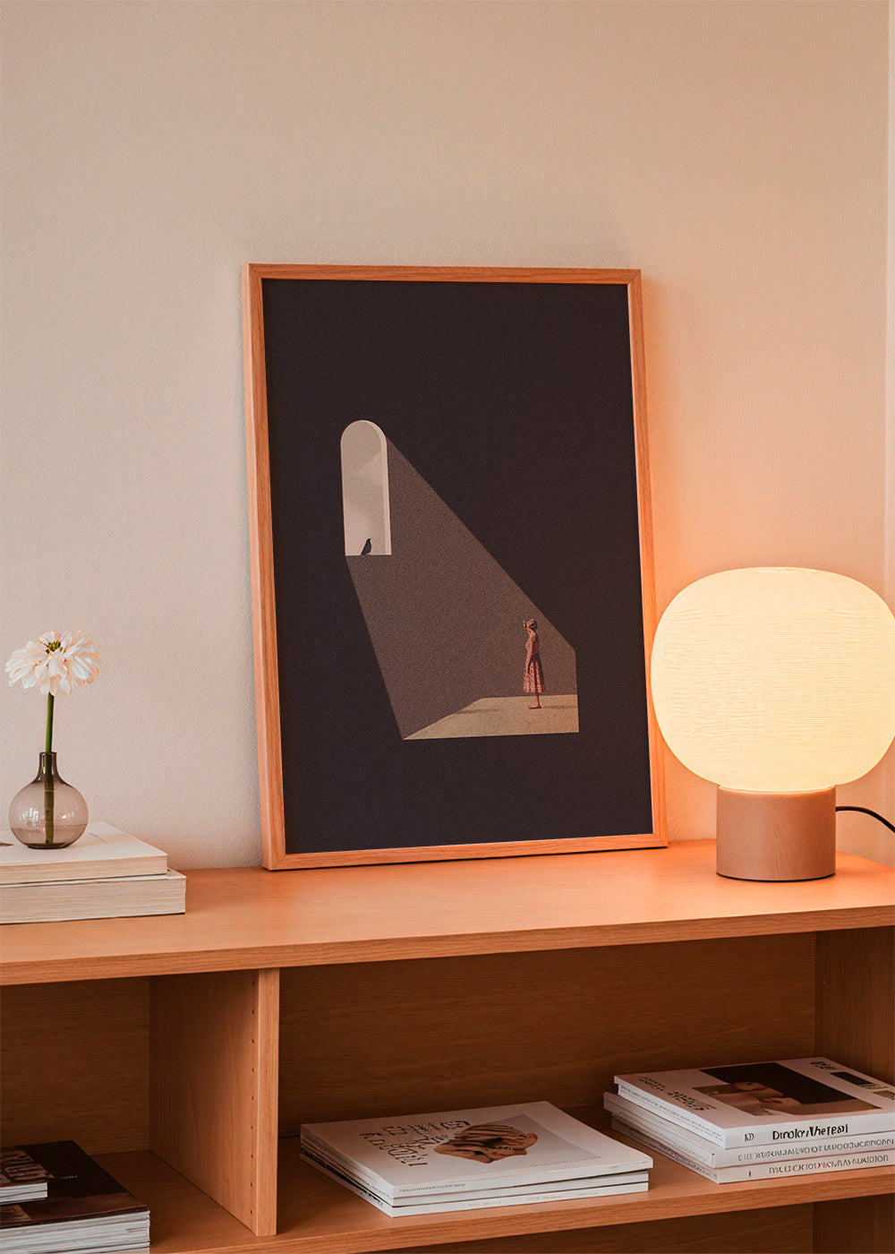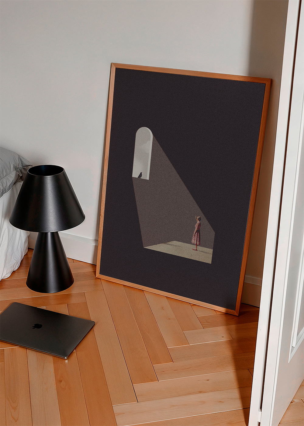 Si vous sélectionnez l'option passe-partout, nous ajouterons le tableau blanc mat au cadre, et nous réduirons le dessin de l'œuvre. Par exemple, si vous sélectionnez un tirage au format 50x70 cm, avec un cadre et un passe-partout couleur chêne, nous réduirons le dessin du tirage au format précédent (40x50cm). Ainsi, il s'adaptera parfaitement à la fenêtre intérieure du passe-partout.