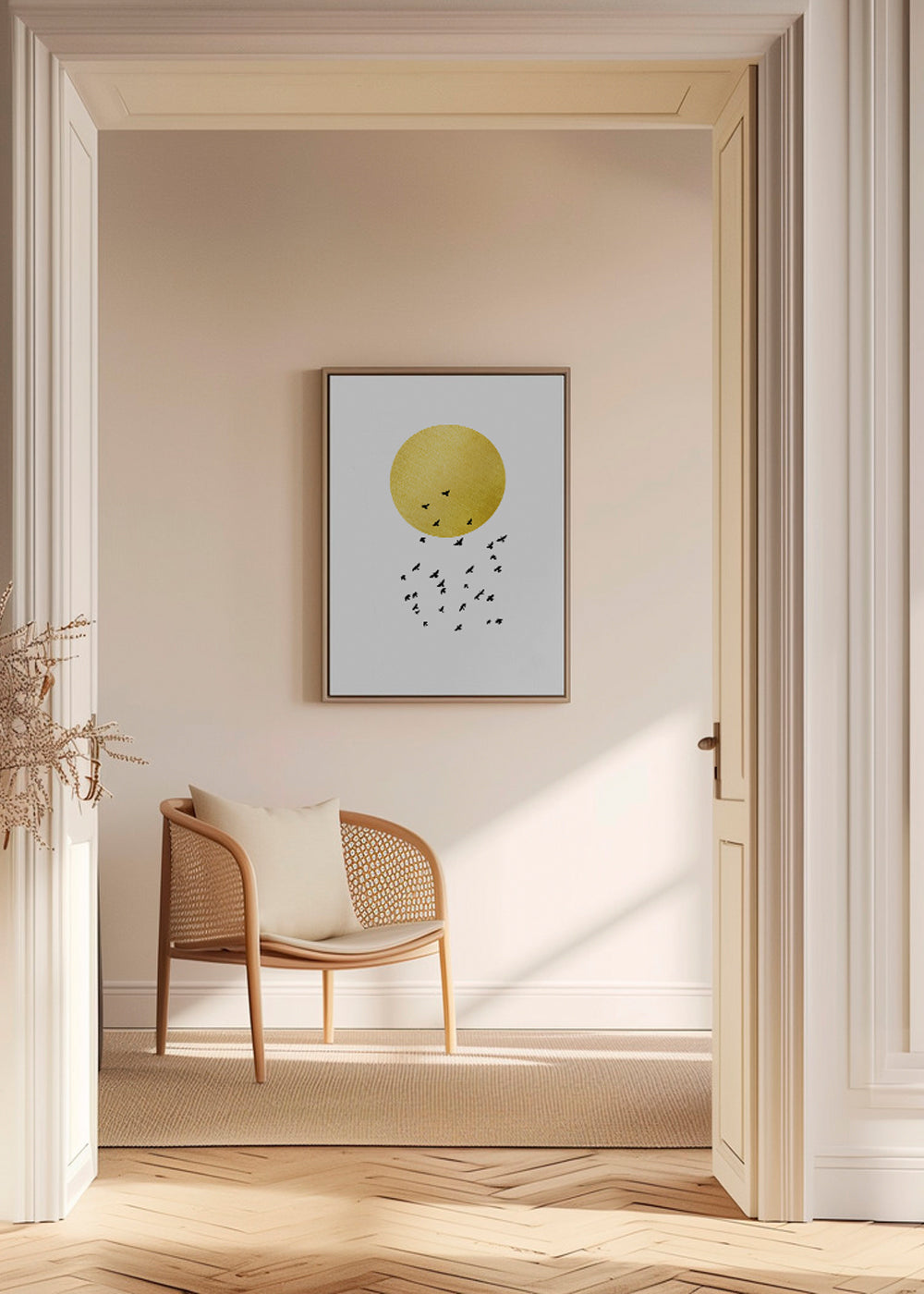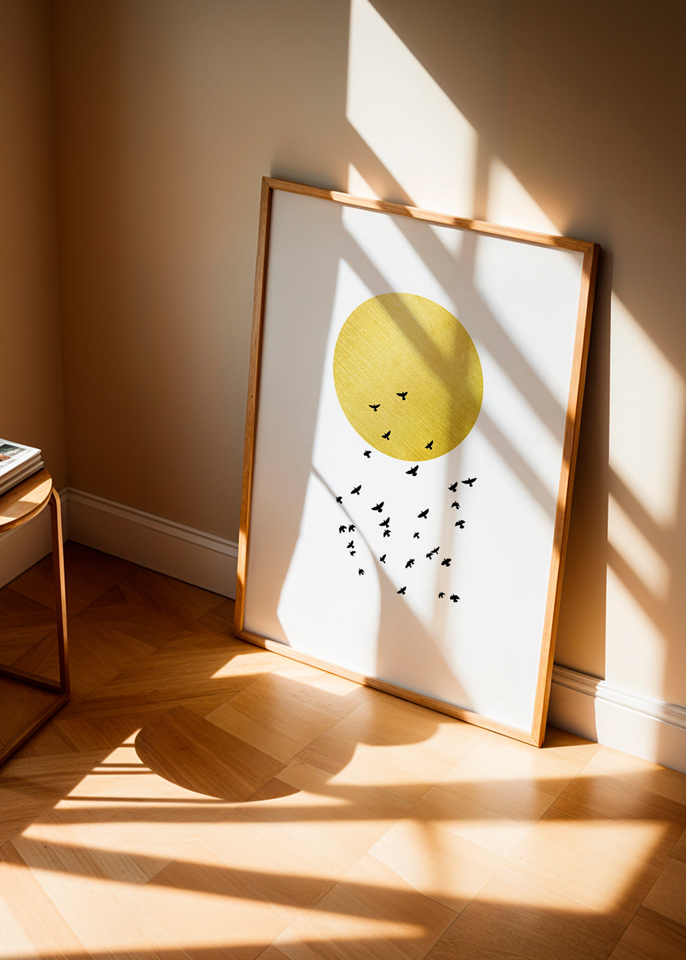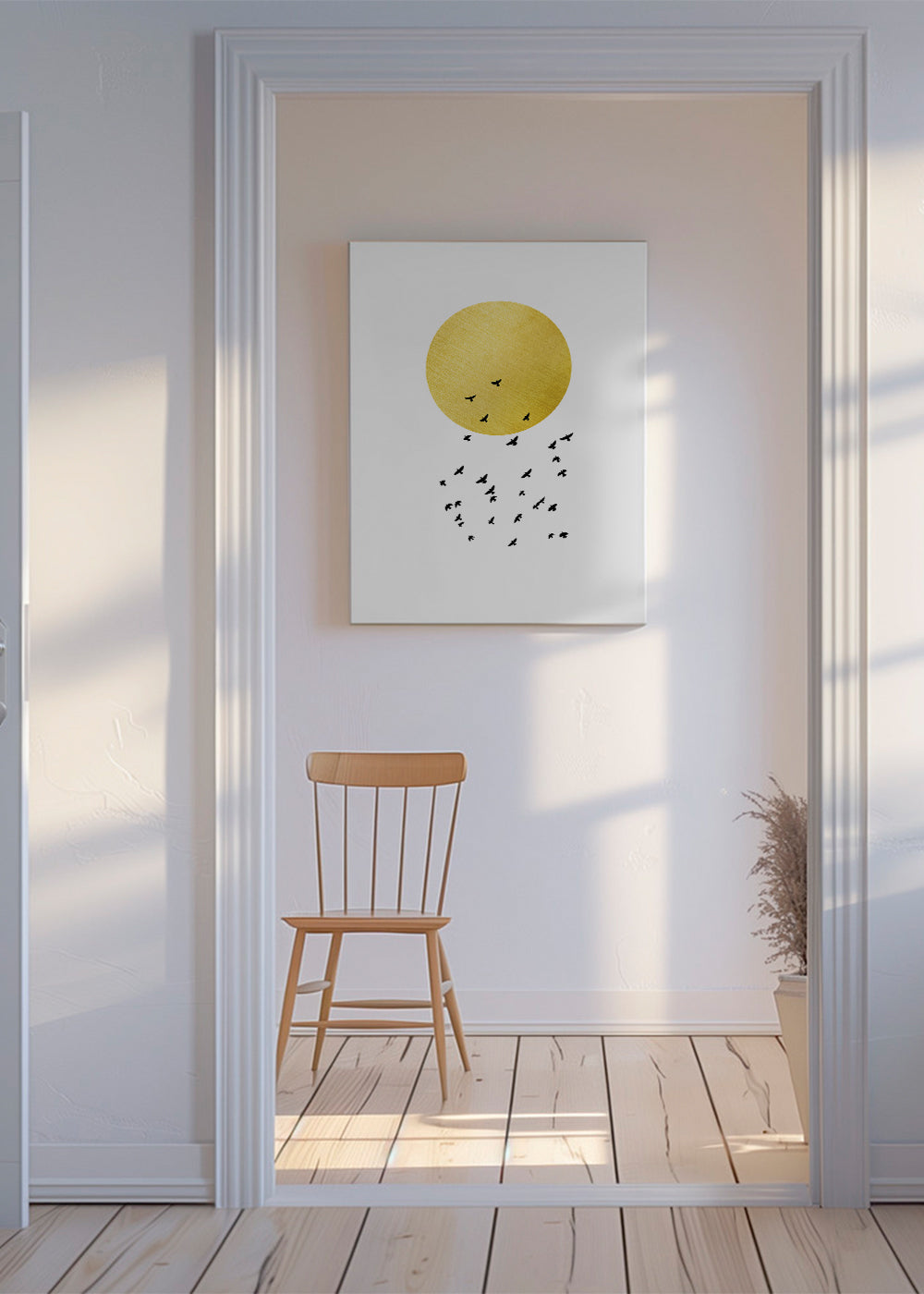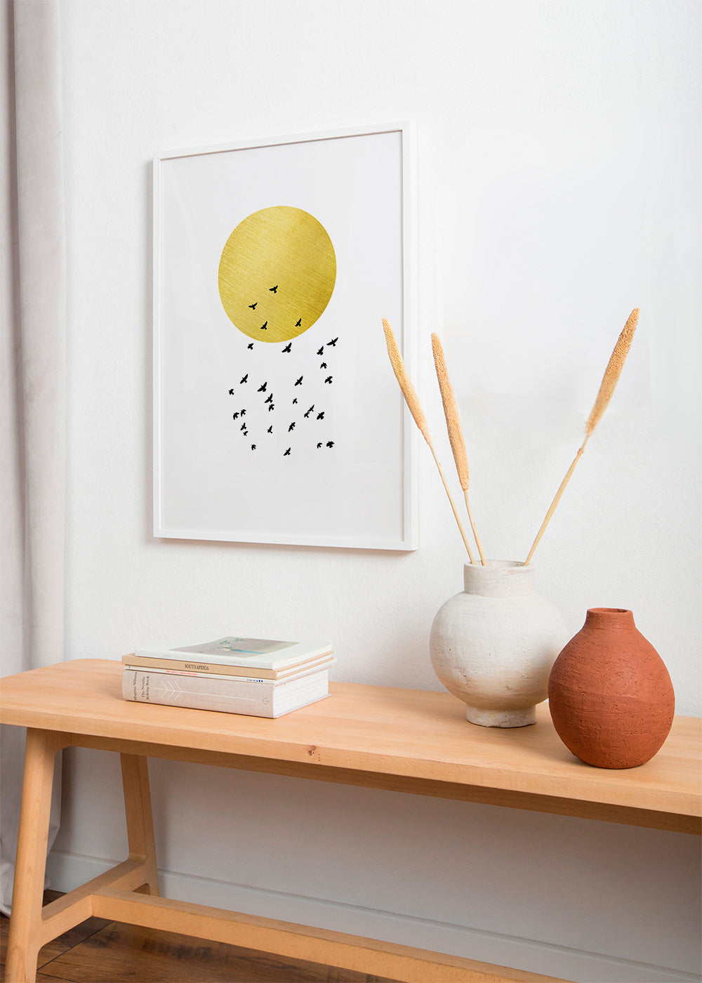 Une plaque de la série affiches oiseaux, conçue par Bondecco, avec des nuances dorés, et dans une orientation portrait. La nature dans son plus bel écrin, les tableaux avec paysages transmettent beaucoup de calme. Art pur et design.