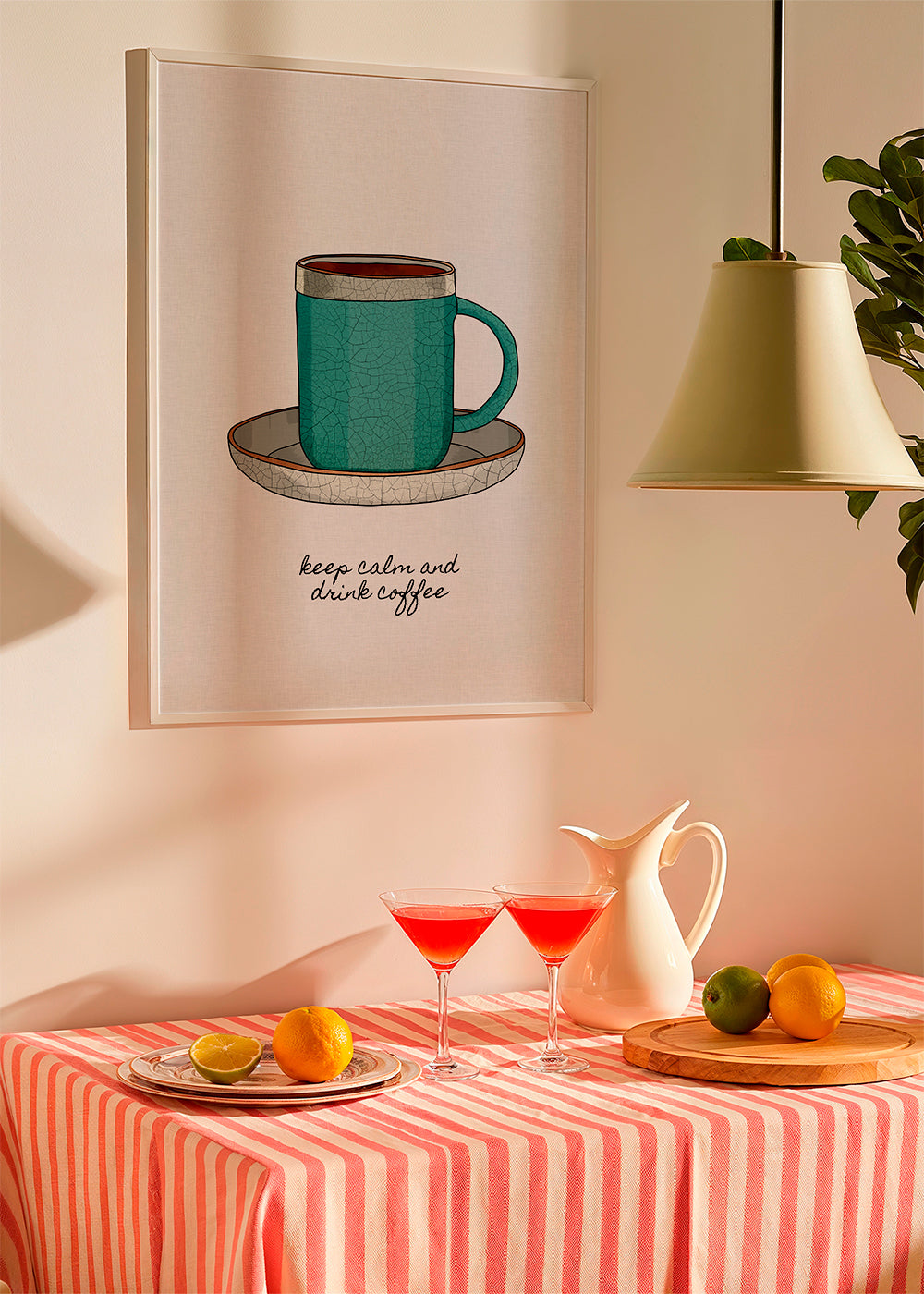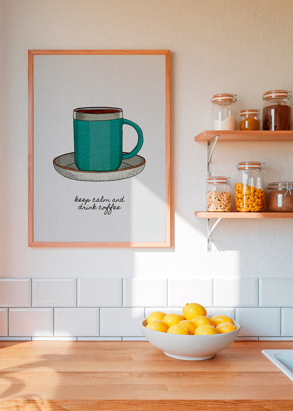 Cette oeuvre de notre collection affiches café, créée par Orara Studio, avec des nuances de tons verts, et pour mettre en portrait. Décorer la cuisine avec des tableaux et des affiches est à la mode, c'est une pièce idéale pour cela. Un merveilleux modèle qui s'harmonise avec votre décoration intérieure.