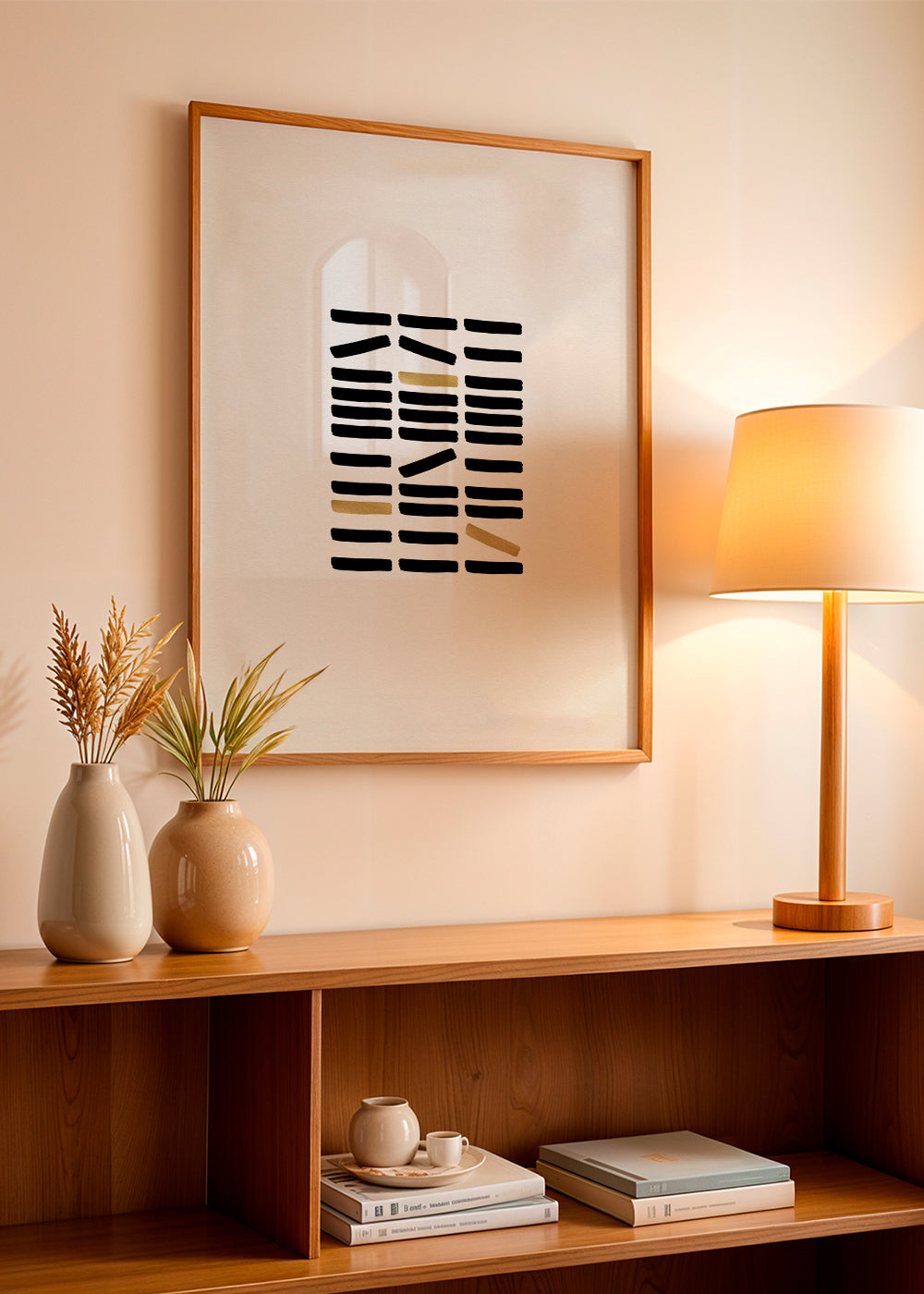 Beau poster du style de nos tableaux avec motifs rayures, conçue par Orara Studio, avec pigments dorés, et en position portrait. Les formes géométriques et abstraites contribuent à créer une atmosphère légère et créative. Des murs pleins de créativité.