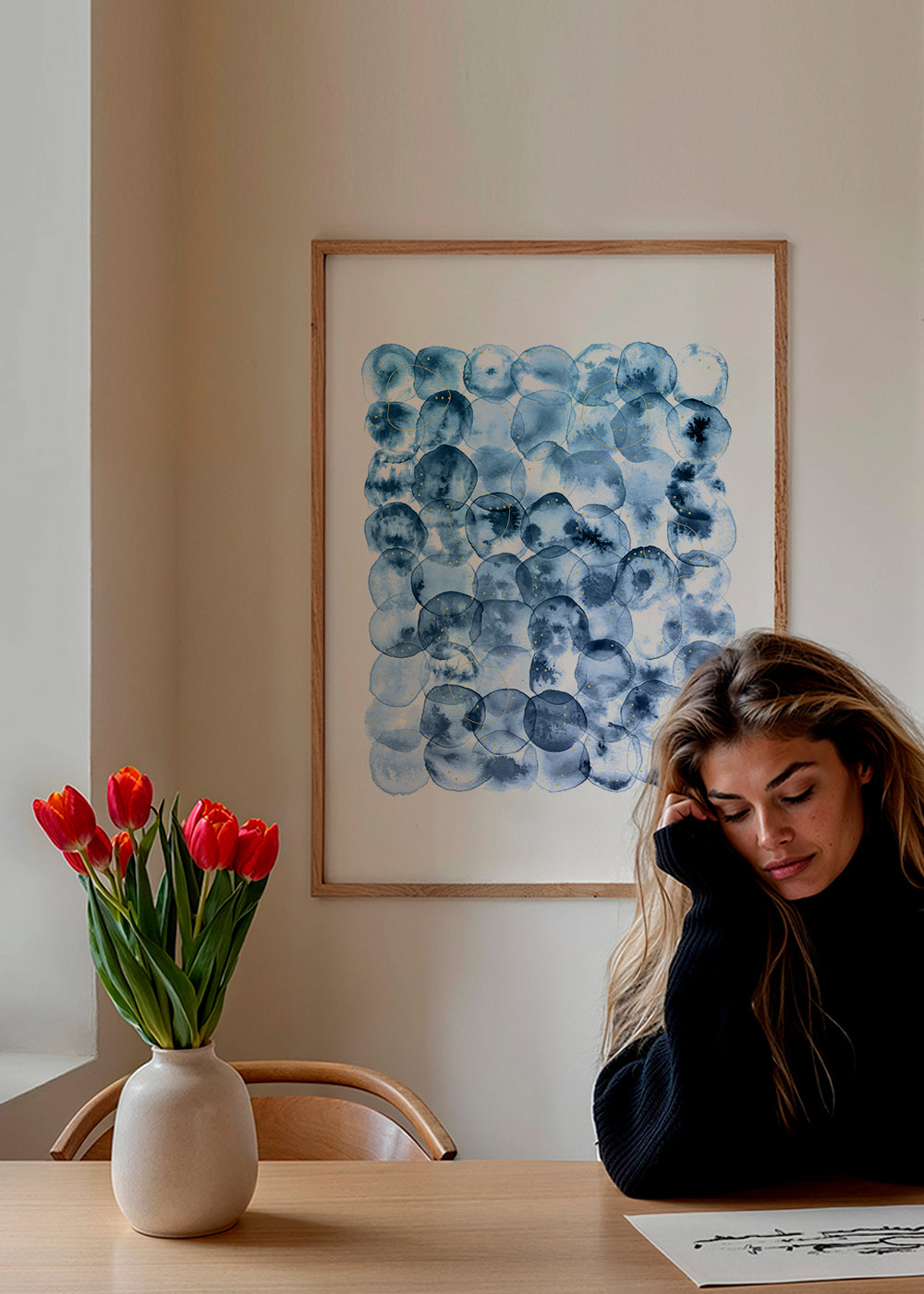 Si vous sélectionnez l'option passe-partout, nous ajouterons le tableau blanc mat au cadre, et nous réduirons le dessin de l'œuvre. Par exemple, si vous sélectionnez un tirage au format 50x70 cm, avec un cadre et un passe-partout couleur chêne, nous réduirons le dessin du tirage au format précédent (40x50cm). Ainsi, il s'adaptera parfaitement à la fenêtre intérieure du passe-partout.