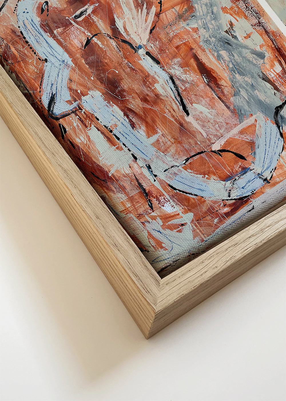 Si vous sélectionnez l'option passe-partout, nous ajouterons le tableau blanc mat au cadre, et nous réduirons le dessin de l'œuvre. Par exemple, si vous sélectionnez un tirage au format 50x70 cm, avec un cadre et un passe-partout couleur chêne, nous réduirons le dessin du tirage au format précédent (40x50cm). Ainsi, il s'adaptera parfaitement à la fenêtre intérieure du passe-partout.