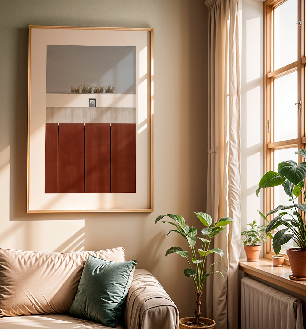 Si vous sélectionnez l'option passe-partout, nous ajouterons le tableau blanc mat au cadre, et nous réduirons le dessin de l'œuvre. Par exemple, si vous sélectionnez un tirage au format 50x70 cm, avec un cadre et un passe-partout couleur chêne, nous réduirons le dessin du tirage au format précédent (40x50cm). Ainsi, il s'adaptera parfaitement à la fenêtre intérieure du passe-partout.