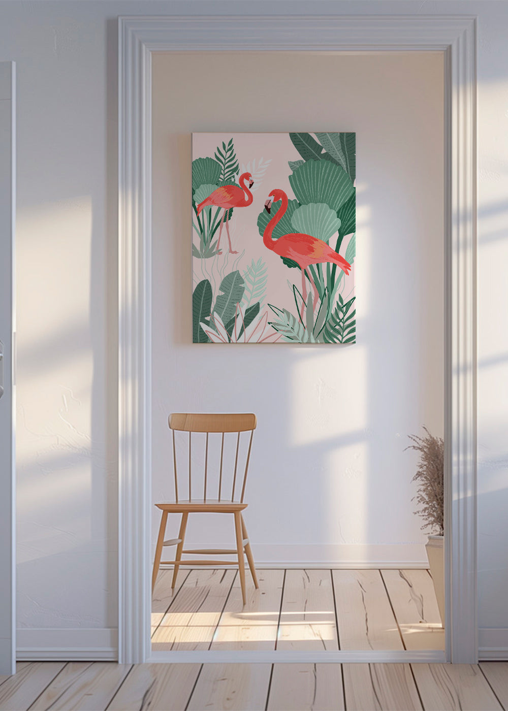 Un affiche de notre répertoire tableaux flamant rose, faite par Goed Blauw, avec des touches verts, et en position portrait. Décorer avec des tableaux d'animaux est un moyen de transmettre de l'énergie grâce à vos murs. Un mur avec de jolis tableaux peut changer l'aspect d'une pièce.