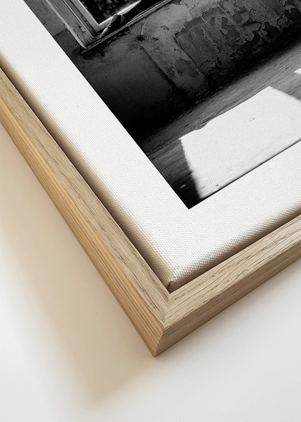 Si vous sélectionnez l'option passe-partout, nous ajouterons le tableau blanc mat au cadre, et nous réduirons le dessin de l'œuvre. Par exemple, si vous sélectionnez un tirage au format 50x70 cm, avec un cadre et un passe-partout couleur chêne, nous réduirons le dessin du tirage au format précédent (40x50cm). Ainsi, il s'adaptera parfaitement à la fenêtre intérieure du passe-partout.