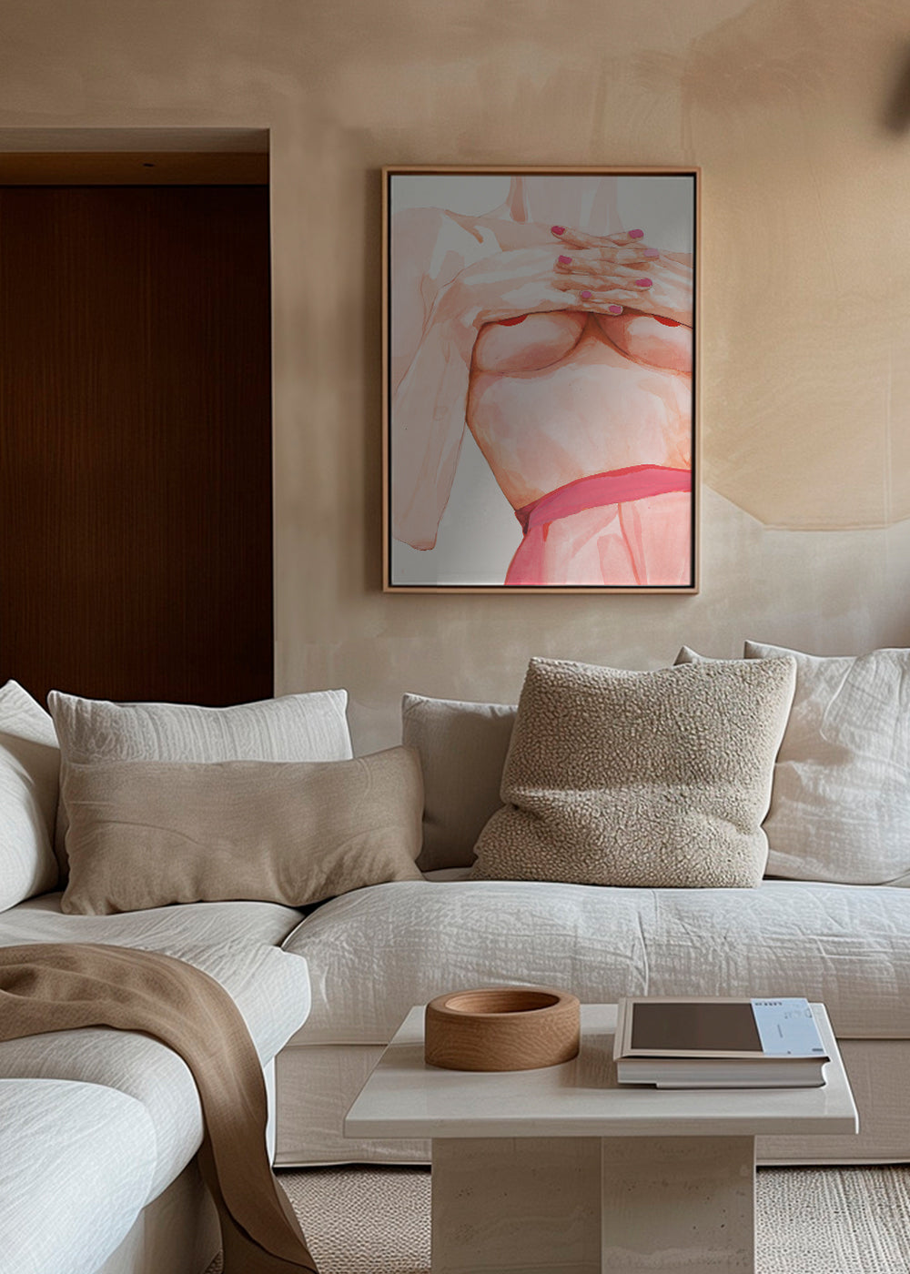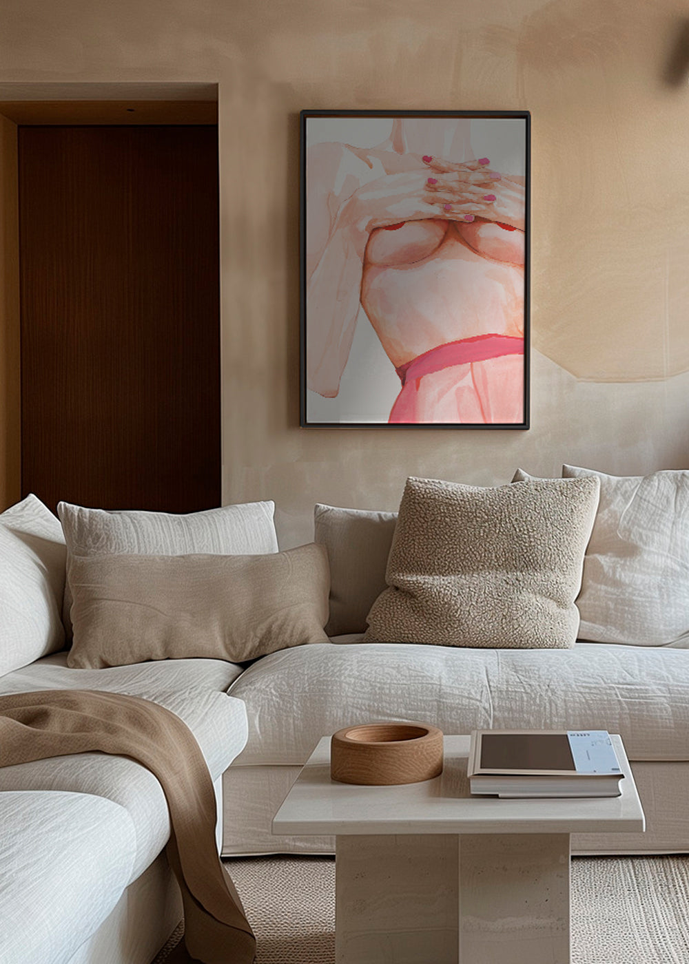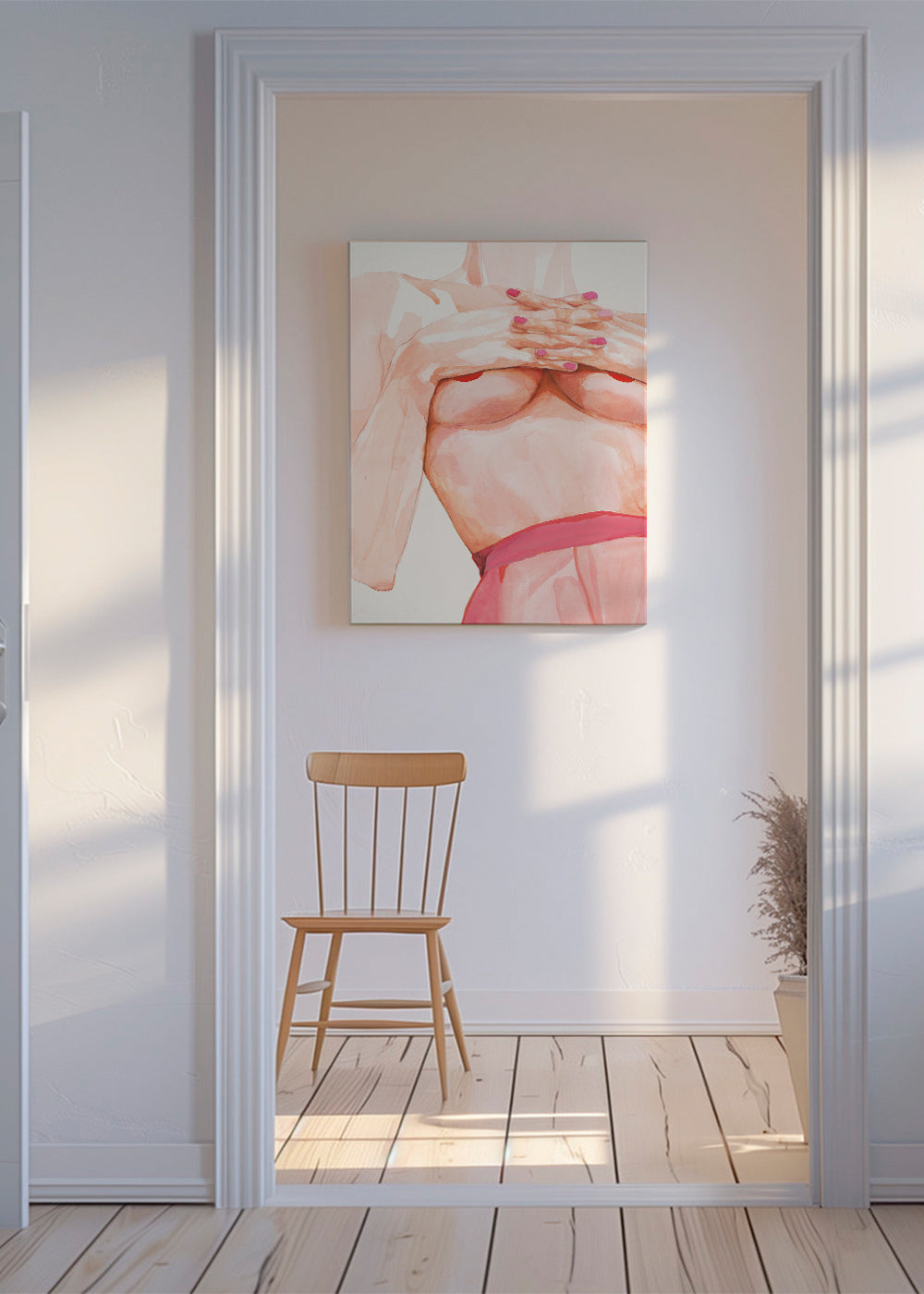 Une plaque de notre collection posters femme, de Sophia Novosel, avec les couleurs roses, et en portrait. C'est une illustration de style simple et propre, combinez-la avec d'autres illustrations pour obtenir une composition artistique. Les murs décorés avec des tableaux sont un must