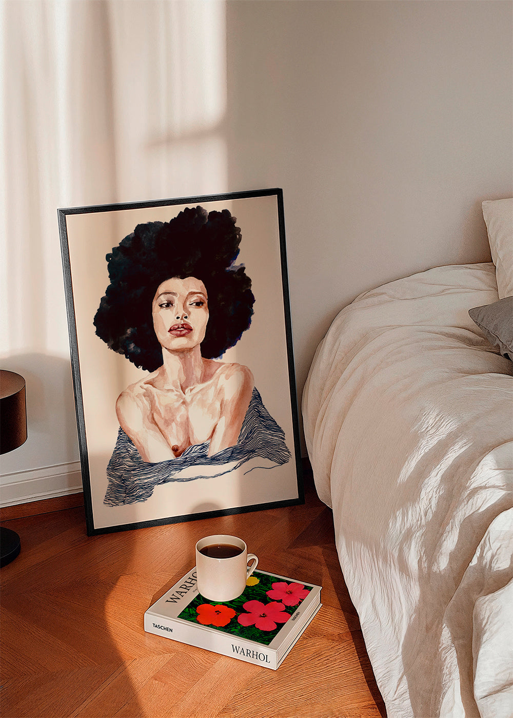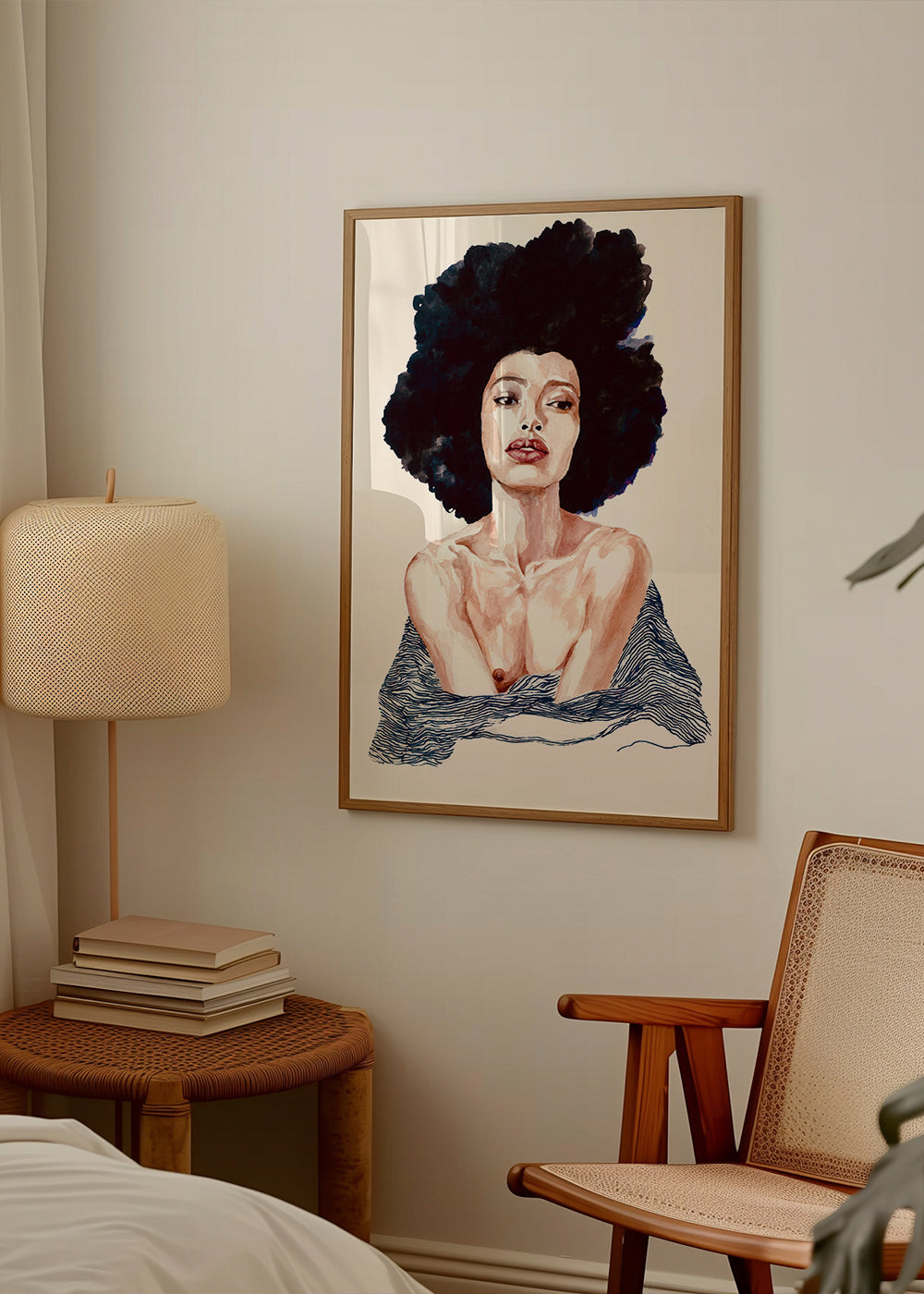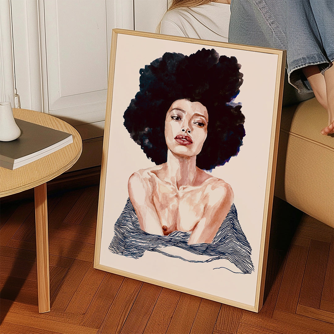 Beau poster de la collection posters femme, de Sophia Novosel, avec pigments noirs, et en portrait. C'est une illustration de style simple et propre, combinez-la avec d'autres illustrations pour obtenir une composition artistique. Art pur et design.