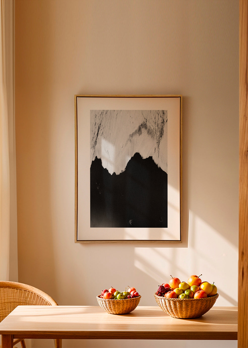 Si vous sélectionnez l'option passe-partout, nous ajouterons le tableau blanc mat au cadre, et nous réduirons le dessin de l'œuvre. Par exemple, si vous sélectionnez un tirage au format 50x70 cm, avec un cadre et un passe-partout couleur chêne, nous réduirons le dessin du tirage au format précédent (40x50cm). Ainsi, il s'adaptera parfaitement à la fenêtre intérieure du passe-partout.