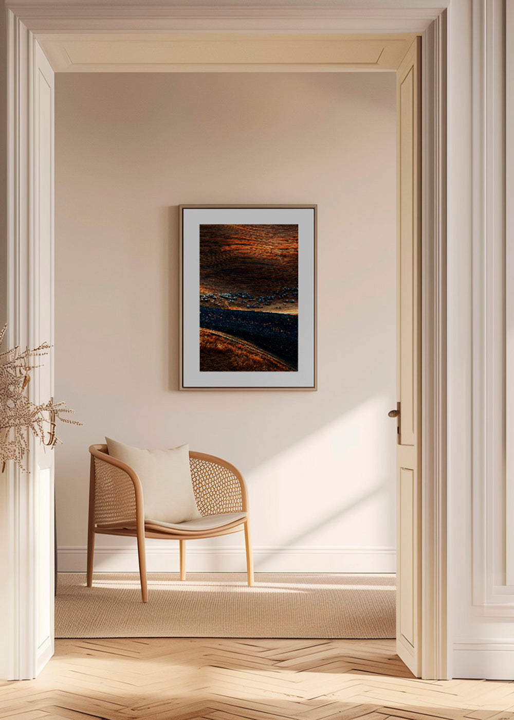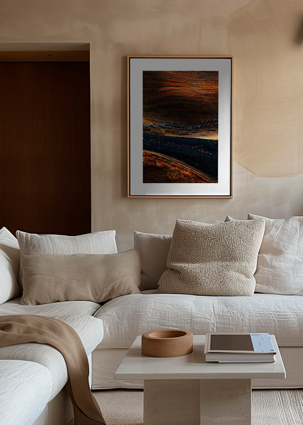 Si vous sélectionnez l'option passe-partout, nous ajouterons le tableau blanc mat au cadre, et nous réduirons le dessin de l'œuvre. Par exemple, si vous sélectionnez un tirage au format 50x70 cm, avec un cadre et un passe-partout couleur chêne, nous réduirons le dessin du tirage au format précédent (40x50cm). Ainsi, il s'adaptera parfaitement à la fenêtre intérieure du passe-partout.