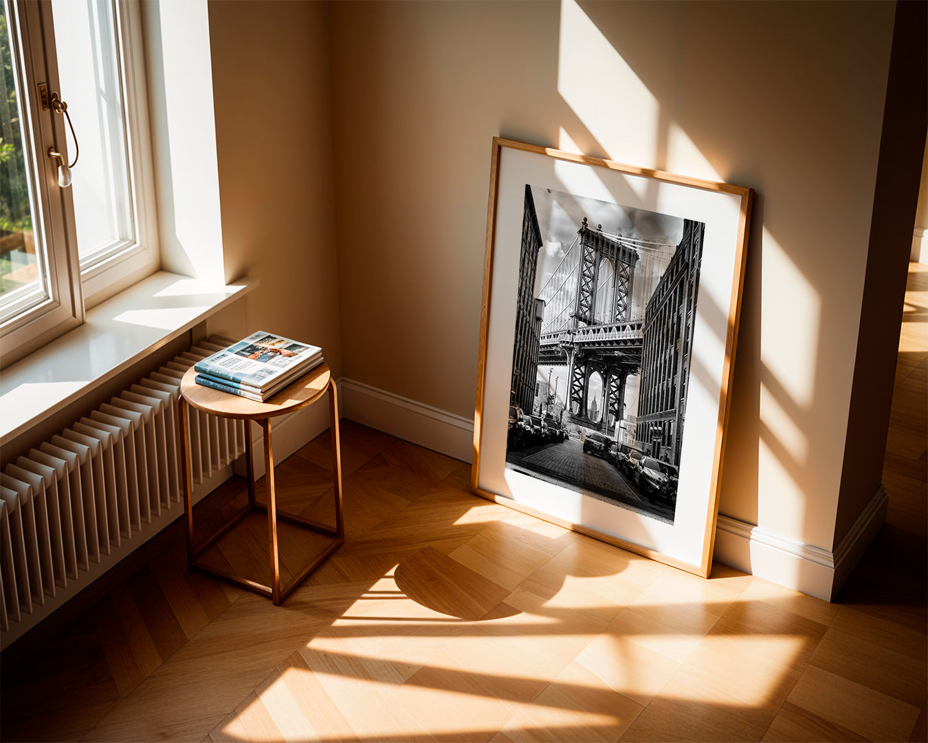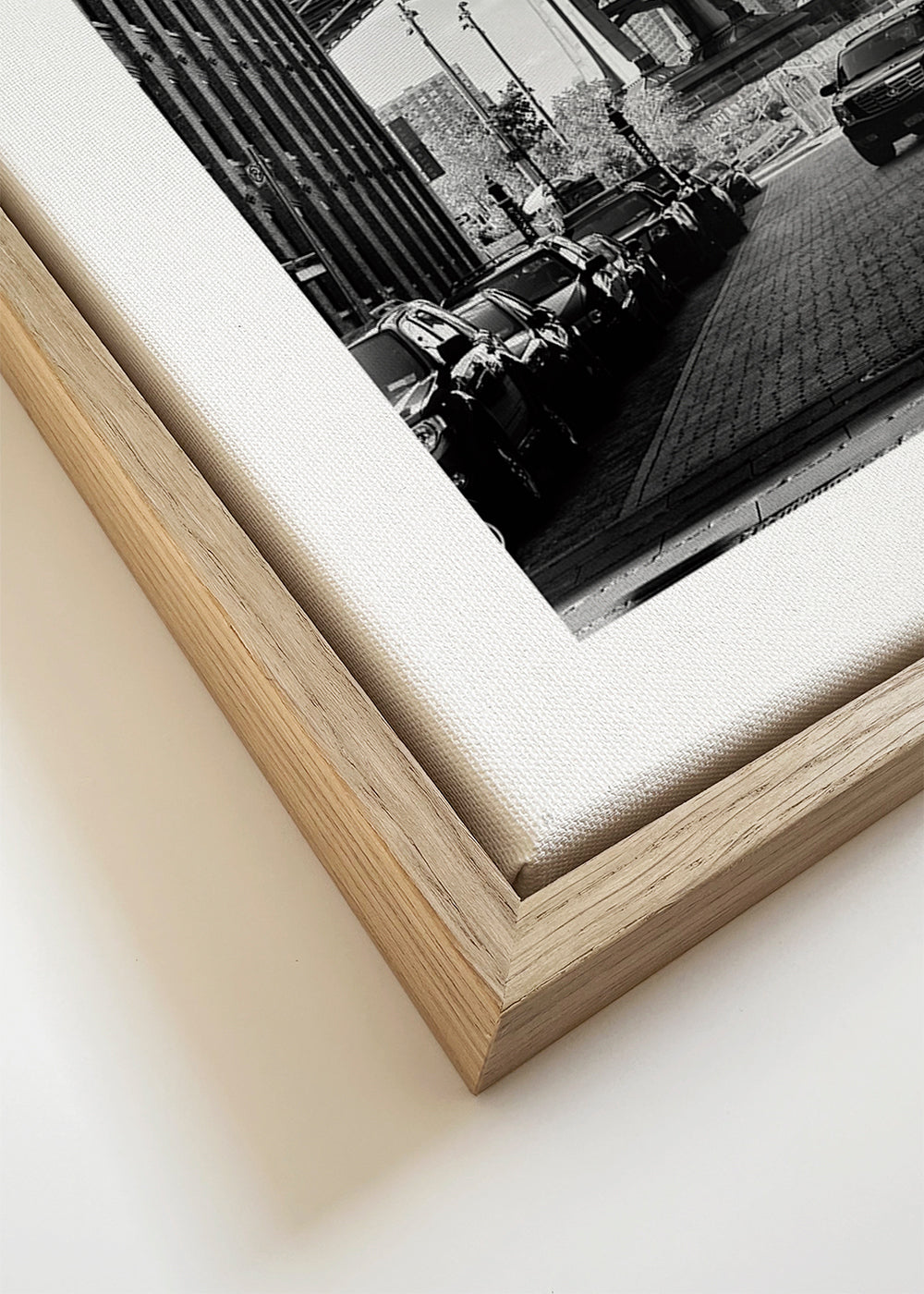 Si vous sélectionnez l'option passe-partout, nous ajouterons le tableau blanc mat au cadre, et nous réduirons le dessin de l'œuvre. Par exemple, si vous sélectionnez un tirage au format 50x70 cm, avec un cadre et un passe-partout couleur chêne, nous réduirons le dessin du tirage au format précédent (40x50cm). Ainsi, il s'adaptera parfaitement à la fenêtre intérieure du passe-partout.