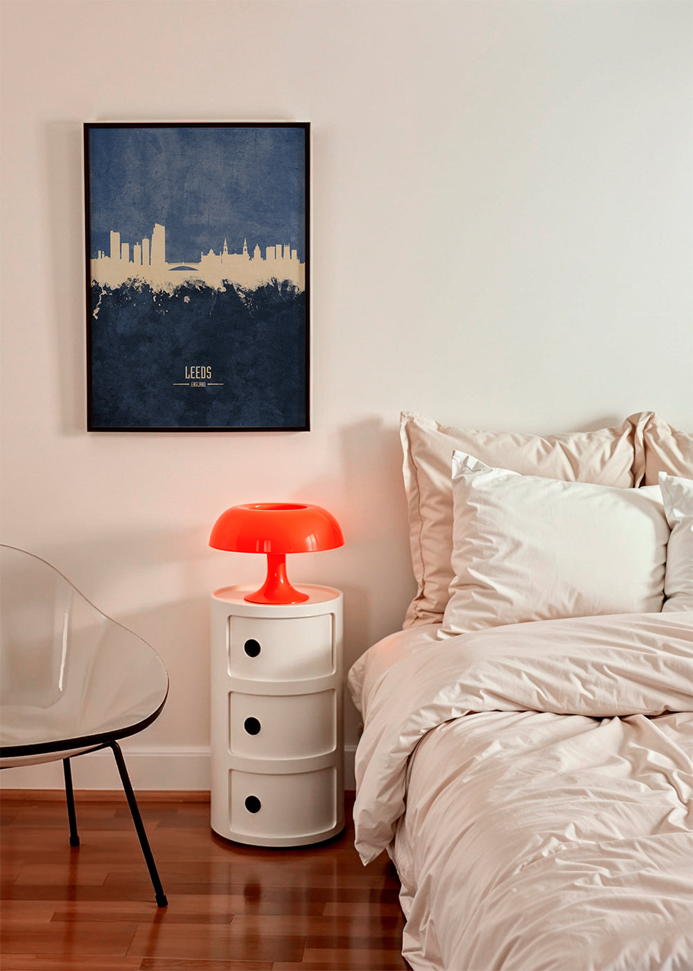 Jolie pièce de notre ensemble skyline posters, de l'artiste Michael Tompsett, avec des touches bleus, et dans une orientation portrait. Combinez les skylines, photos et autres cartes des villes pour créer une composition adaptée aux voyageurs. La touche finale que vous recherchiez.