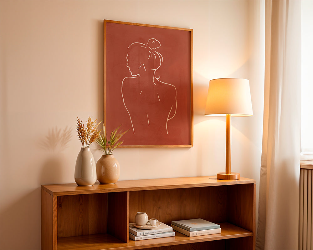 Si vous sélectionnez l'option passe-partout, nous ajouterons le tableau blanc mat au cadre, et nous réduirons le dessin de l'œuvre. Par exemple, si vous sélectionnez un tirage au format 50x70 cm, avec un cadre et un passe-partout couleur chêne, nous réduirons le dessin du tirage au format précédent (40x50cm). Ainsi, il s'adaptera parfaitement à la fenêtre intérieure du passe-partout.