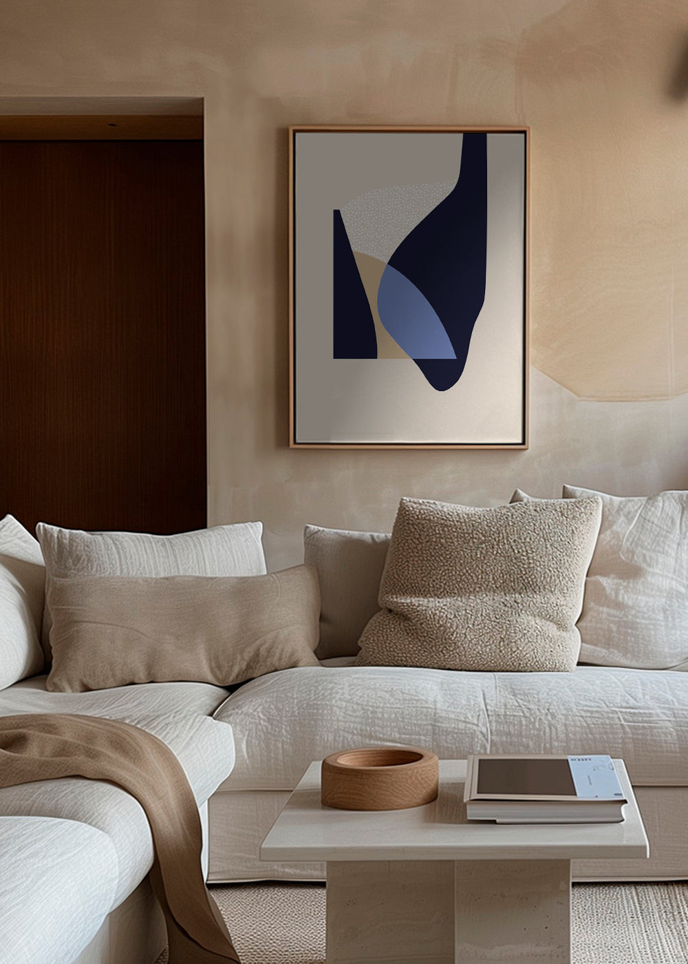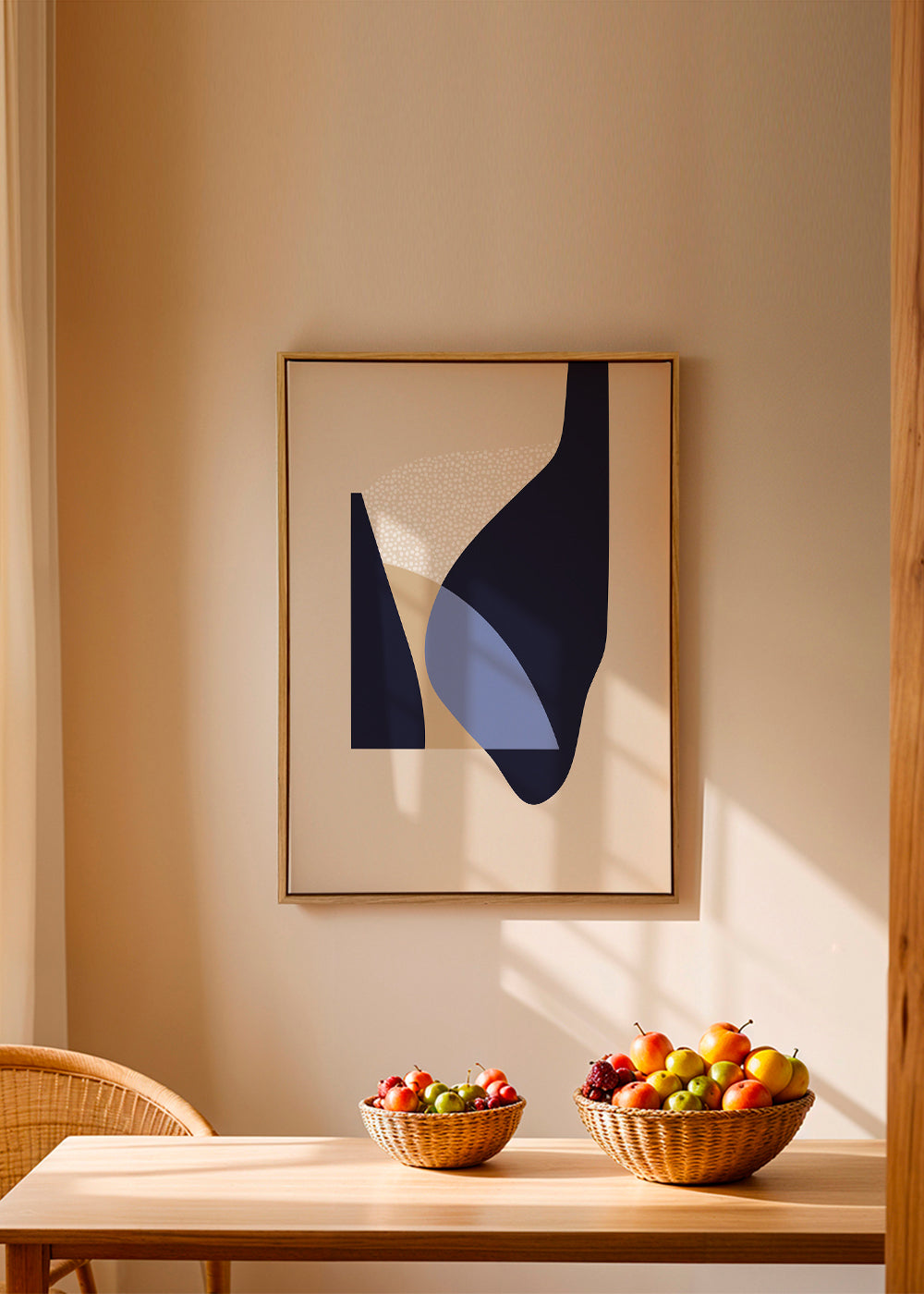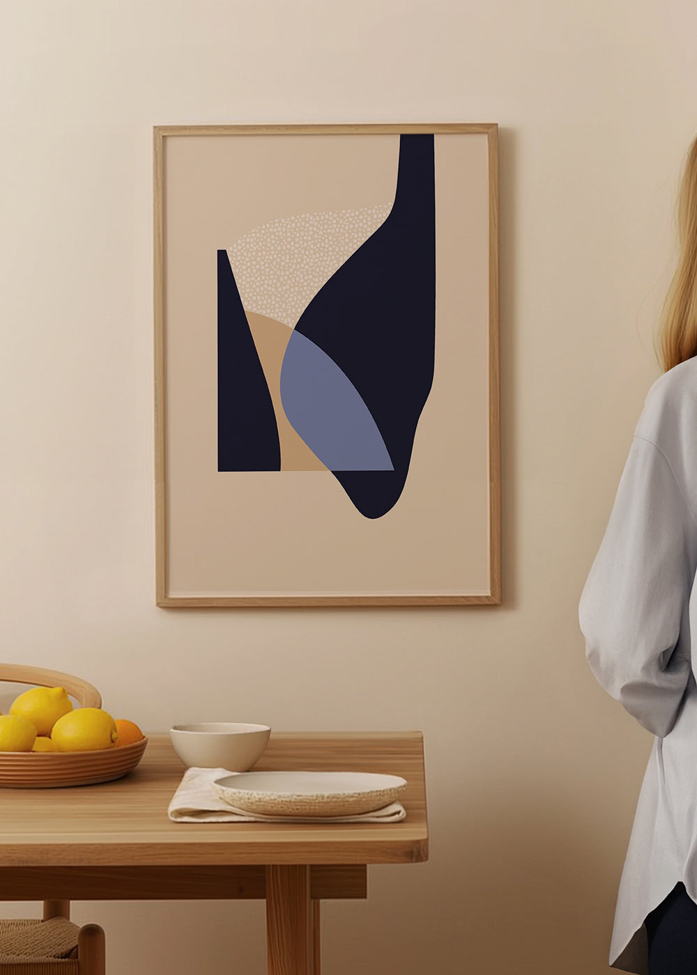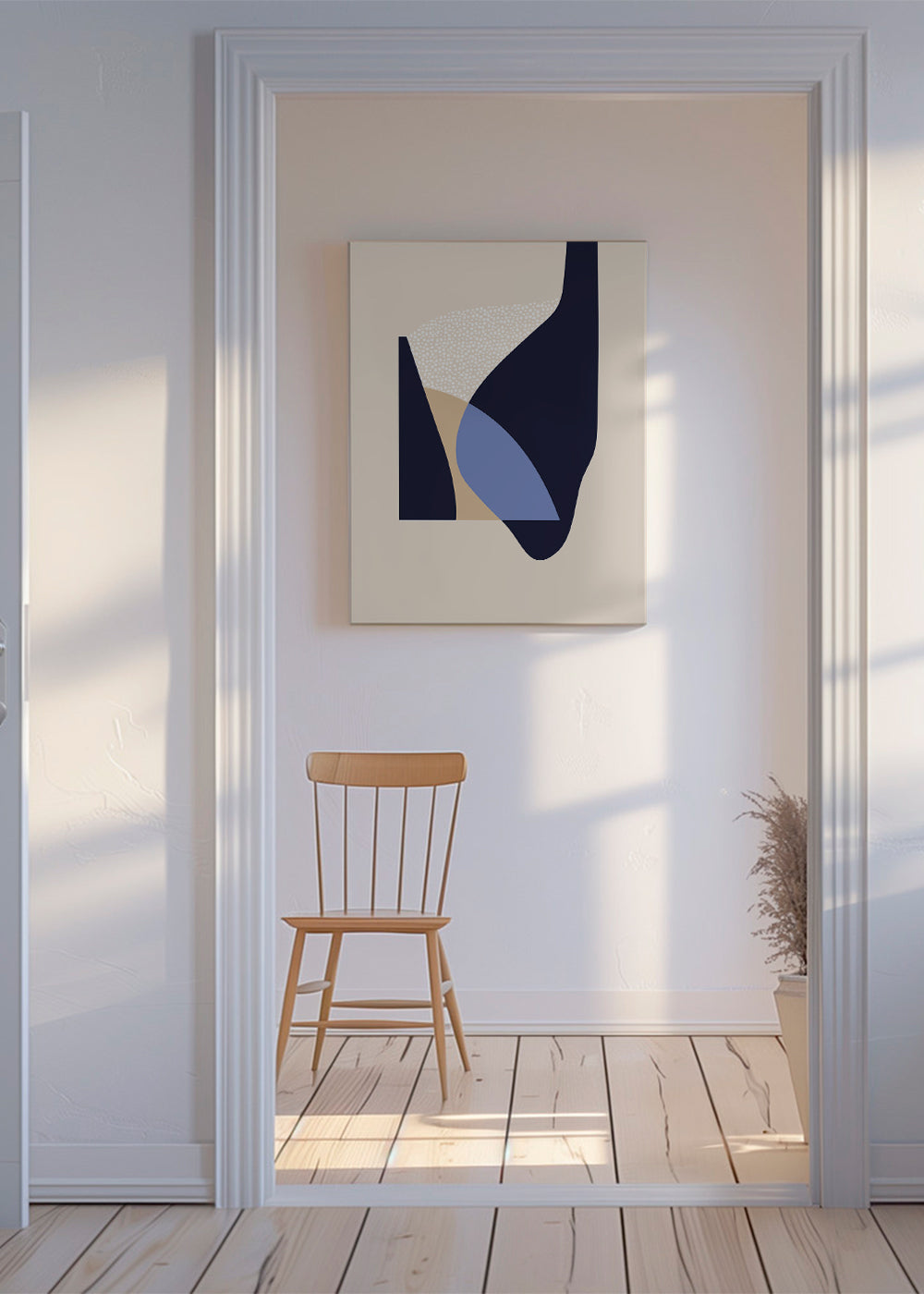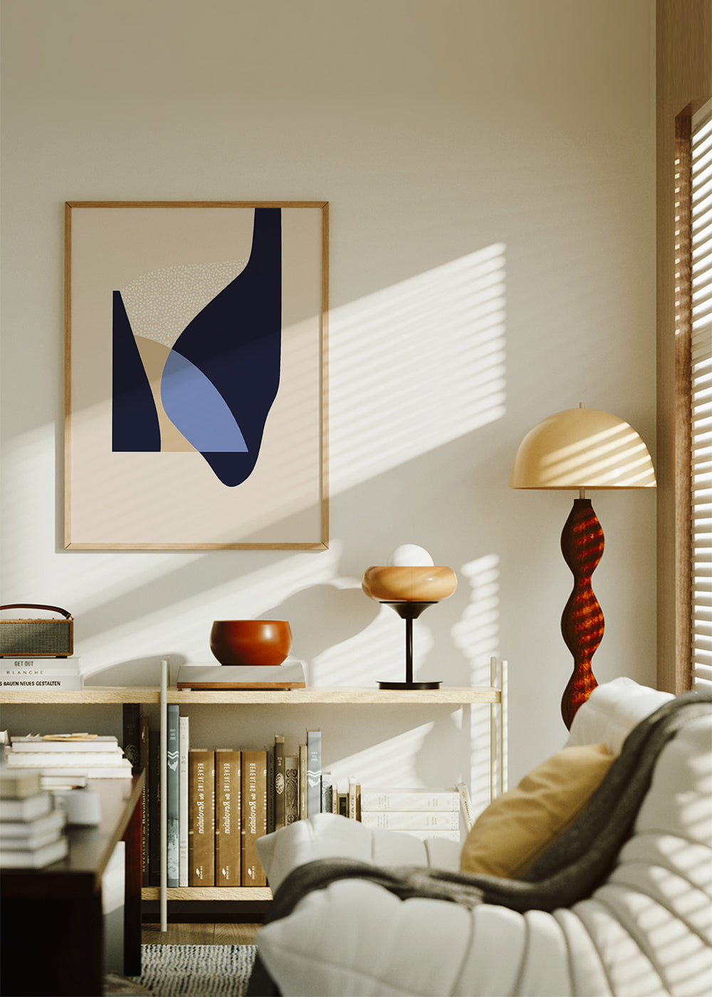 Beau affiche de notre collection tableaux géométrique, conçue par Anna Mainz, avec des nuances bleus, et avec orientation portrait. Les formes géométriques et abstraites contribuent à créer une atmosphère légère et créative. Des murs élégants pour des maisons chics.