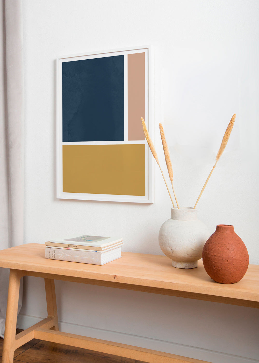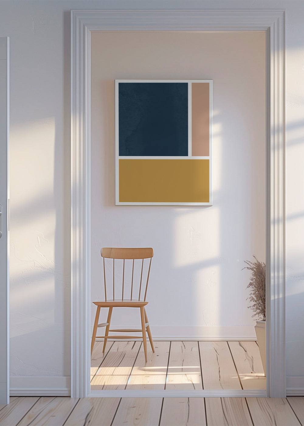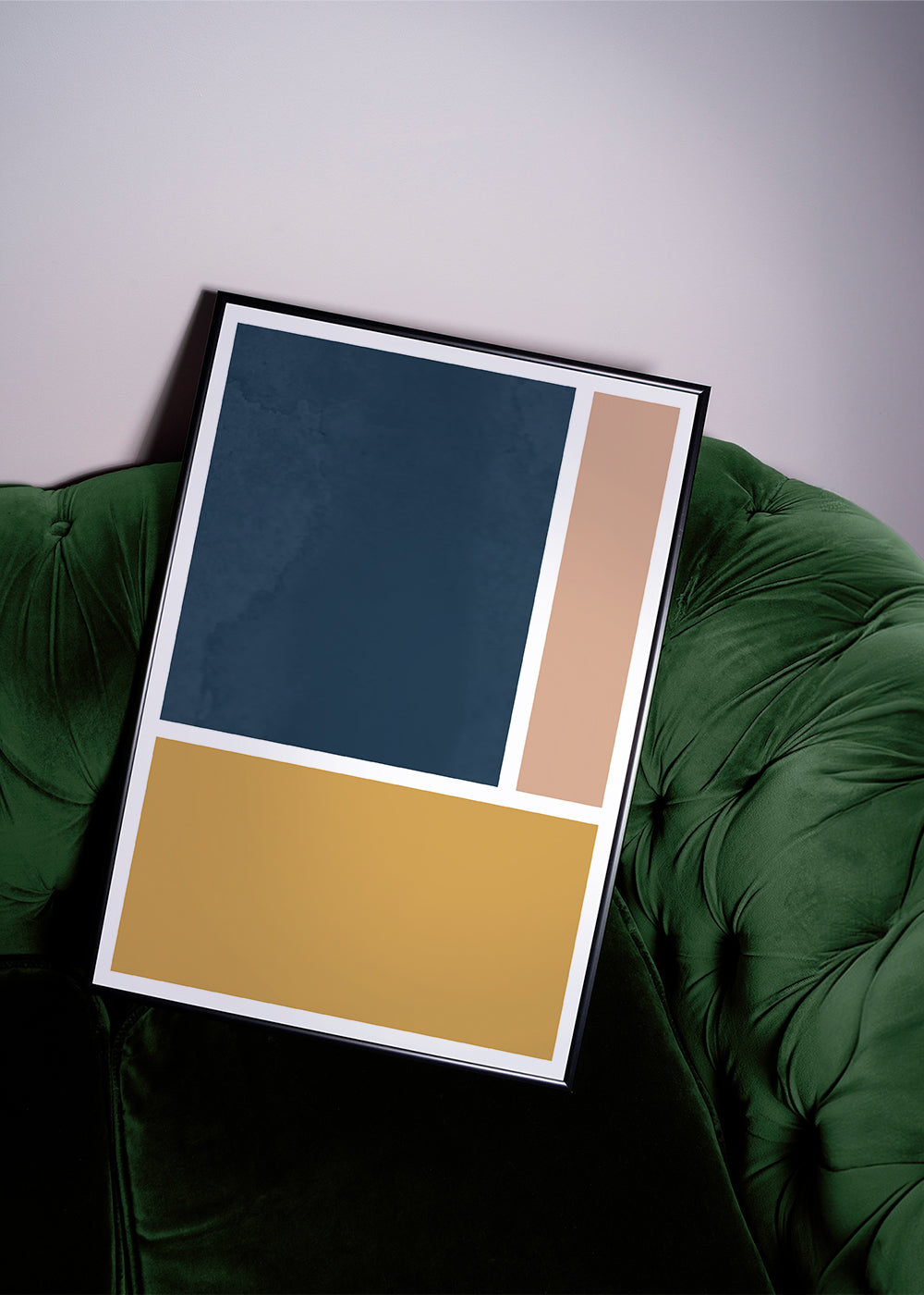 Une image de notre collection tableaux géométrique, original de Muthyger, avec des touches bleus, et pour mettre en position portrait. Les formes géométriques et abstraites contribuent à créer une atmosphère légère et créative. Oubliez les murs ennuyeux et fades.