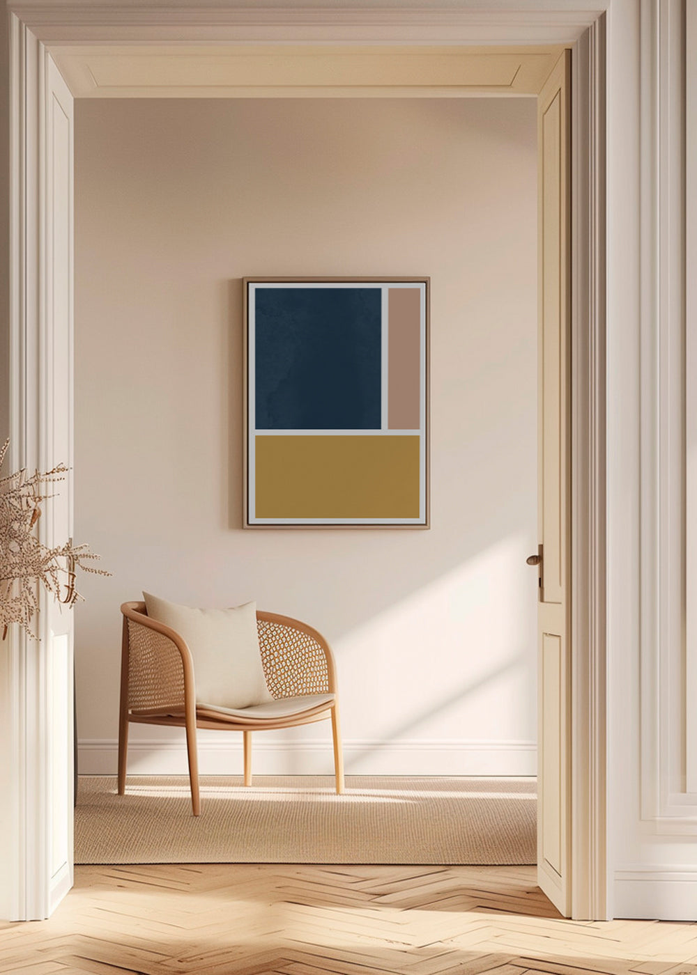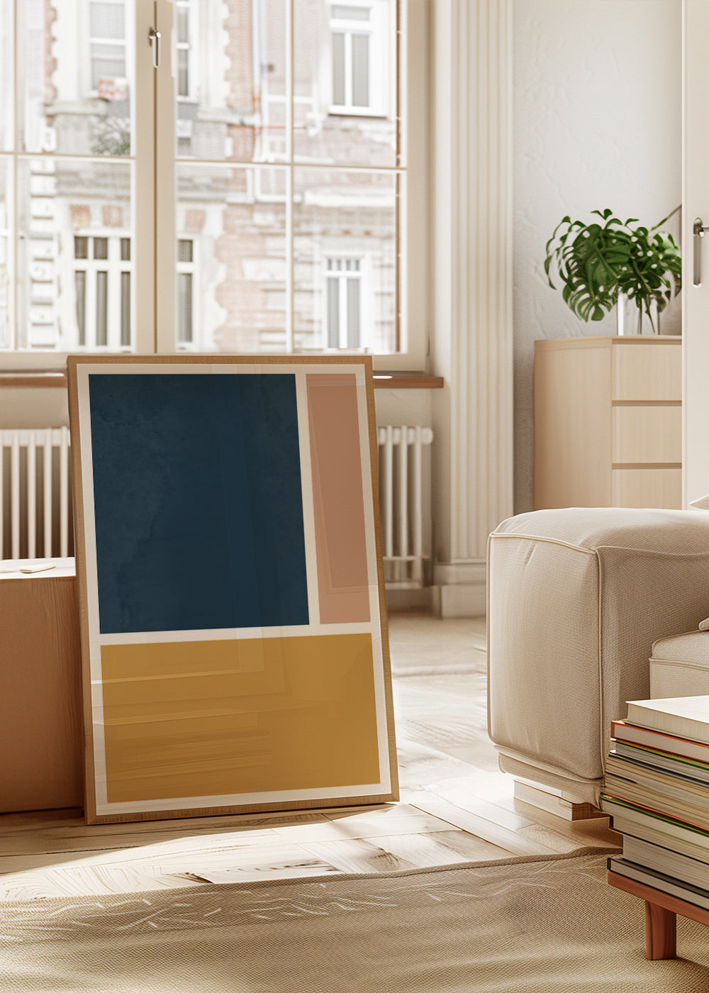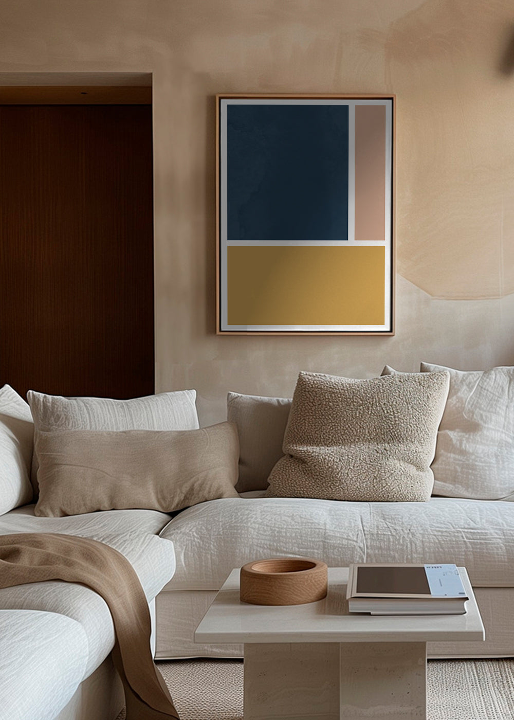 Une image de notre collection tableaux géométrique, original de Muthyger, avec des touches bleus, et pour mettre en position portrait. Les formes géométriques et abstraites contribuent à créer une atmosphère légère et créative. Oubliez les murs ennuyeux et fades.