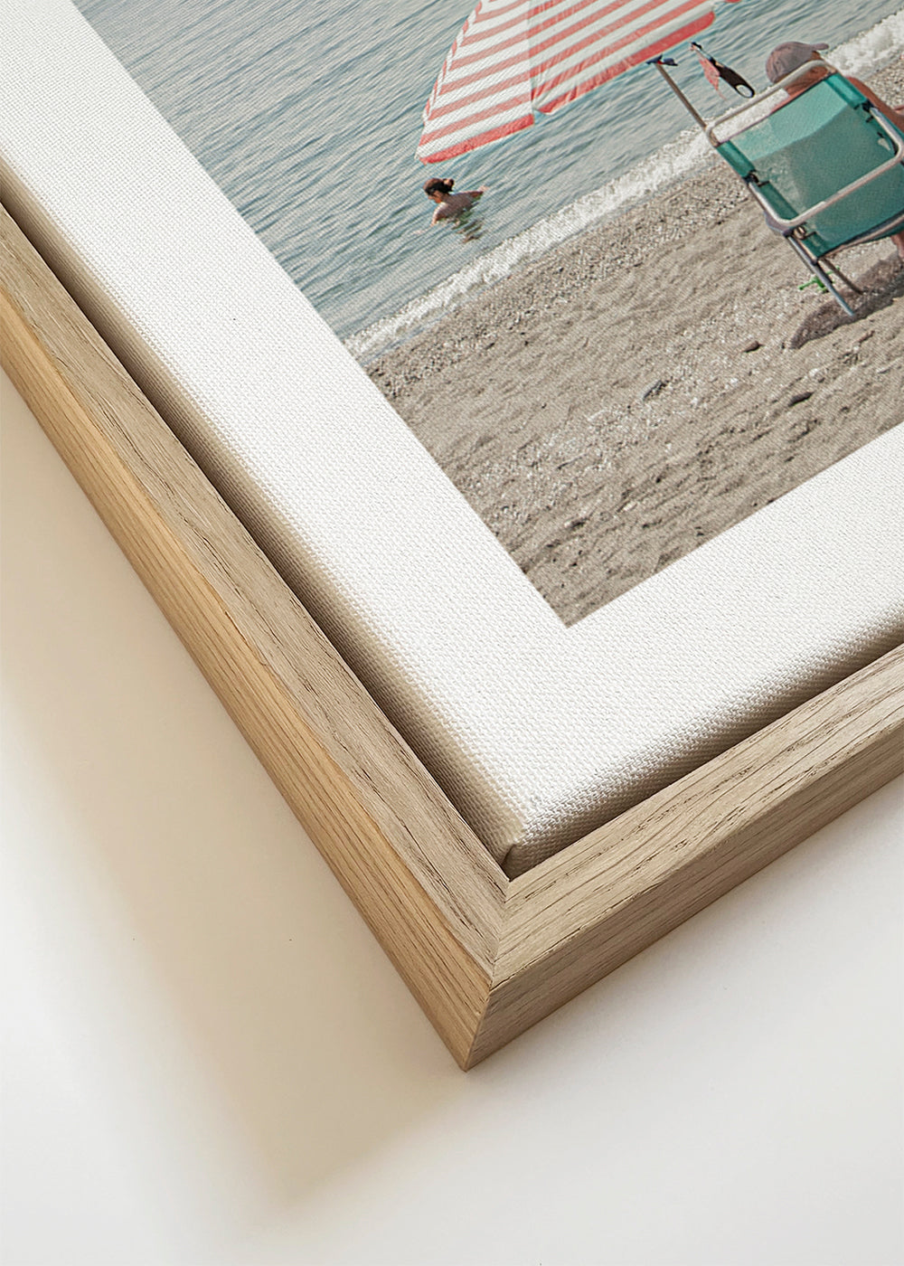 Si vous sélectionnez l'option passe-partout, nous ajouterons le tableau blanc mat au cadre, et nous réduirons le dessin de l'œuvre. Par exemple, si vous sélectionnez un tirage au format 50x70 cm, avec un cadre et un passe-partout couleur chêne, nous réduirons le dessin du tirage au format précédent (40x50cm). Ainsi, il s'adaptera parfaitement à la fenêtre intérieure du passe-partout.