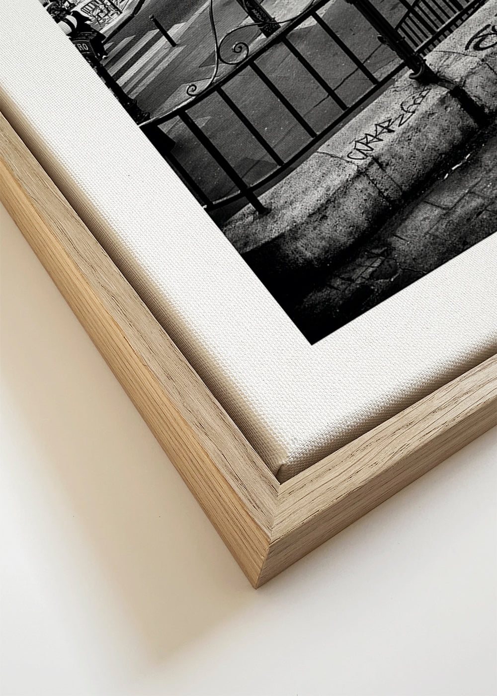 Si vous sélectionnez l'option passe-partout, nous ajouterons le tableau blanc mat au cadre, et nous réduirons le dessin de l'œuvre. Par exemple, si vous sélectionnez un tirage au format 50x70 cm, avec un cadre et un passe-partout couleur chêne, nous réduirons le dessin du tirage au format précédent (40x50cm). Ainsi, il s'adaptera parfaitement à la fenêtre intérieure du passe-partout.