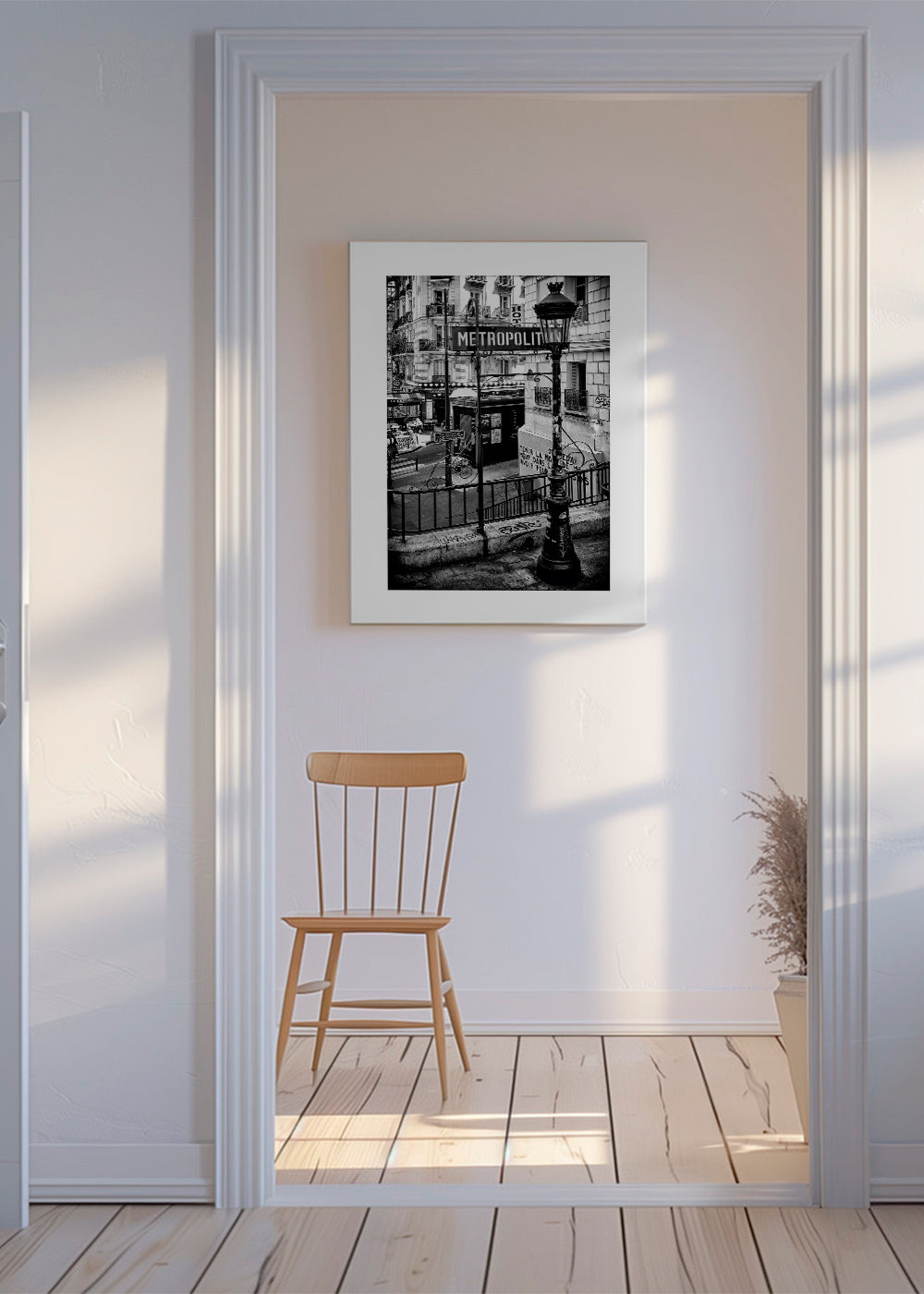 Le passe-partout est un panneau blanc mat qui entoure l'affiche pour la protéger du méthacrylate, et qui améliore également l'expressivité de l'œuvre et met en valeur ses détails.