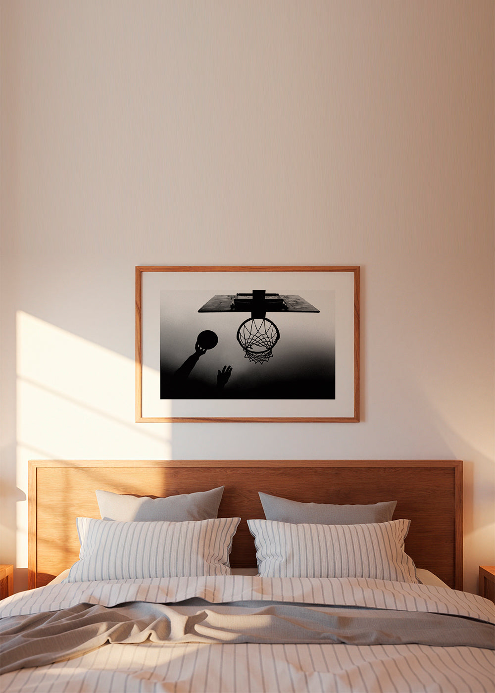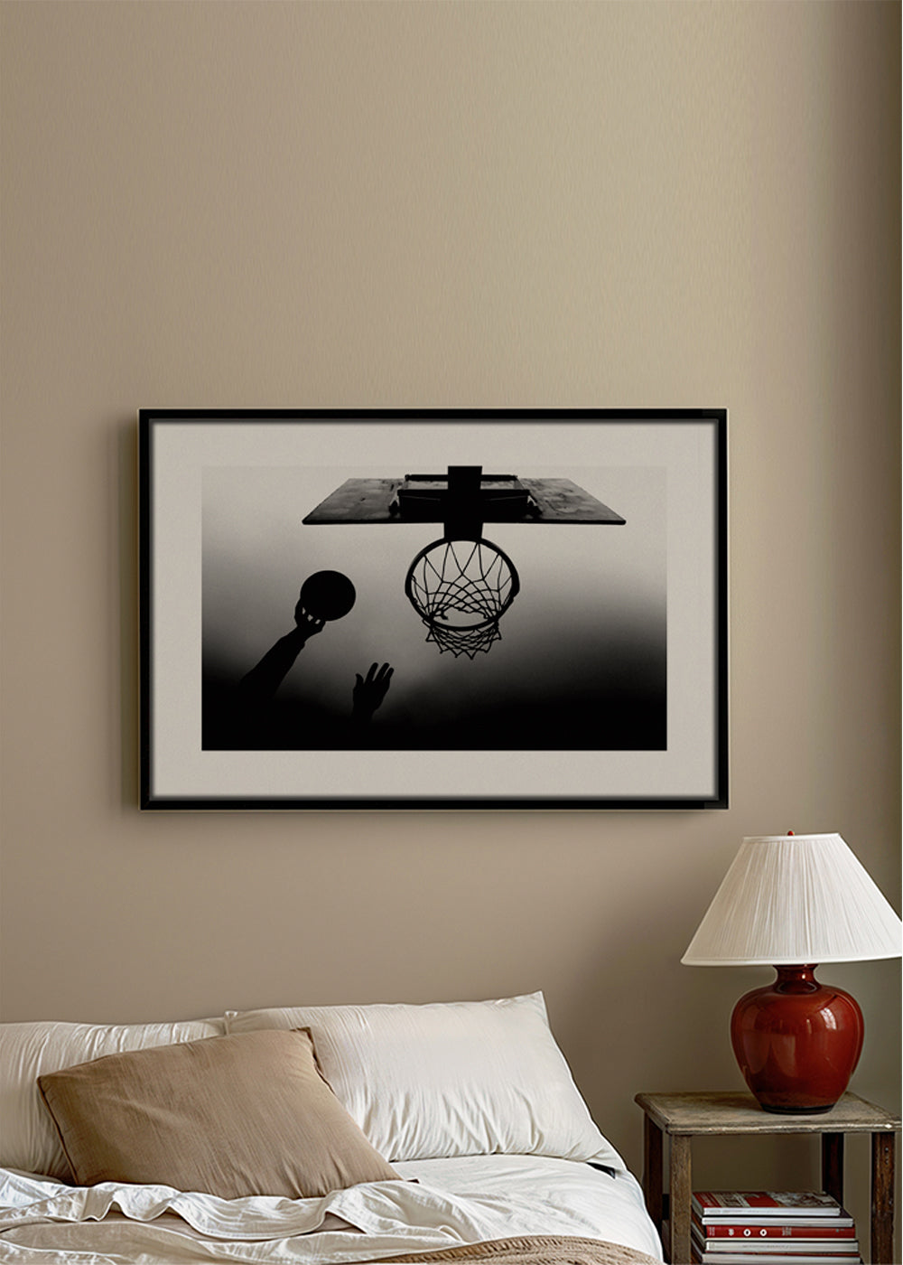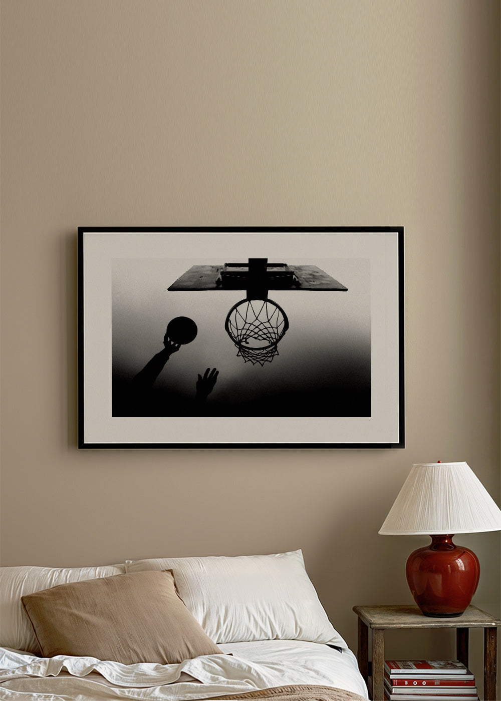 Ce affiche de notre répertoire posters basket, avec les couleurs monochromes, et en format paysage. Vous aimez le sport ? Nos affiches et tableaux de sport sont la meilleure option pour décorer vos espaces vides. Donnez un nouveau look à votre décoration intérieure. Cette œuvre comprend une bordure blanche qui encadre le modèle pour en rehausser le style.