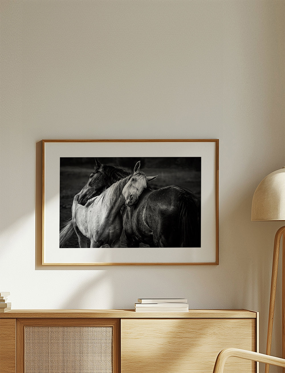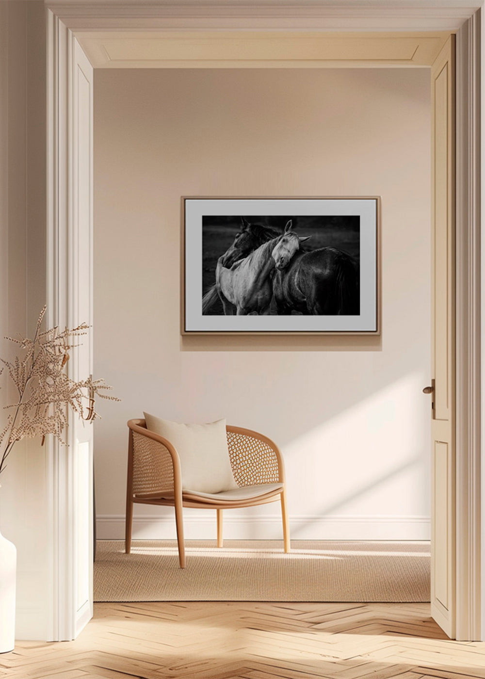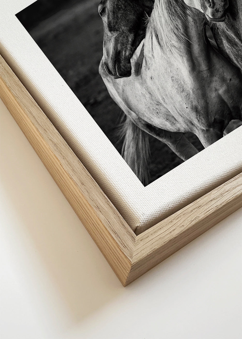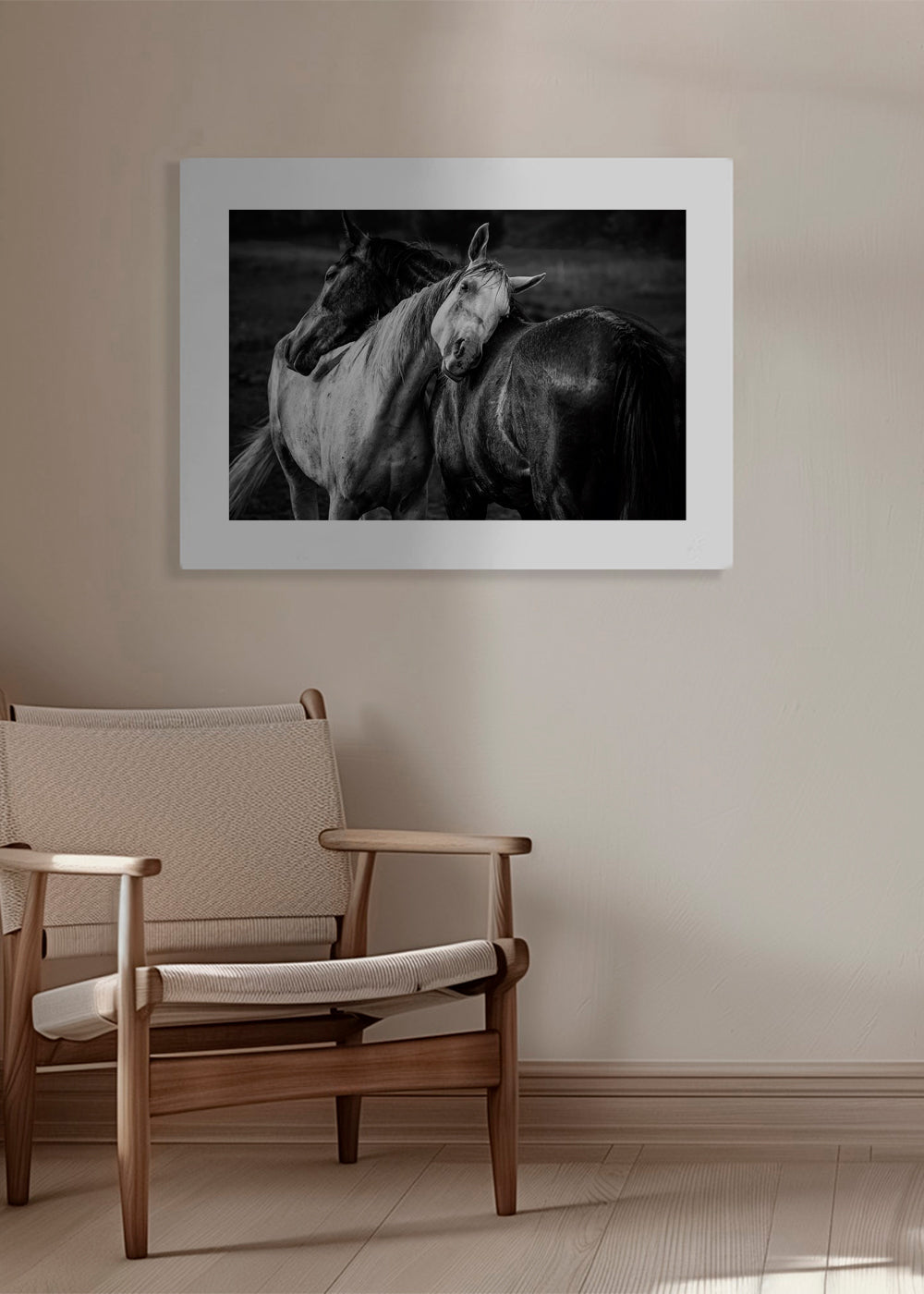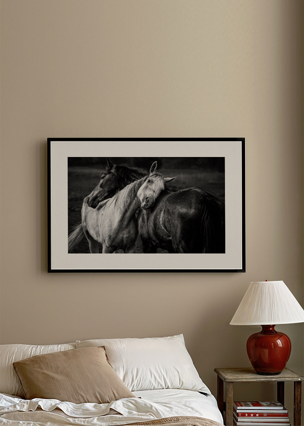 Beau tableau de notre collection posters cheval, avec des nuances monochromes, et pour mettre en orientation format paysage. Décorer avec des tableaux d'animaux est un moyen de transmettre de l'énergie grâce à vos murs. Il n'y a pas de murs laids ou jolis, il y a des murs vides ou décorés. Cette œuvre comprend une bordure blanche qui encadre le modèle pour en rehausser le style.