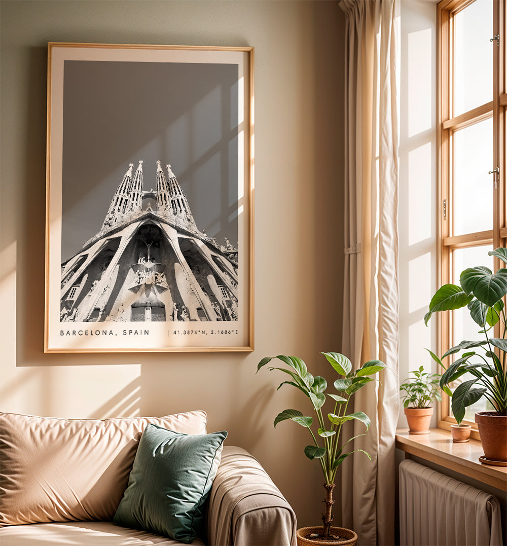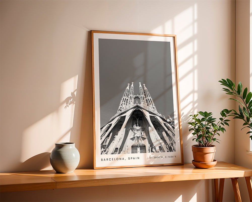 Si vous sélectionnez l'option passe-partout, nous ajouterons le tableau blanc mat au cadre, et nous réduirons le dessin de l'œuvre. Par exemple, si vous sélectionnez un tirage au format 50x70 cm, avec un cadre et un passe-partout couleur chêne, nous réduirons le dessin du tirage au format précédent (40x50cm). Ainsi, il s'adaptera parfaitement à la fenêtre intérieure du passe-partout.