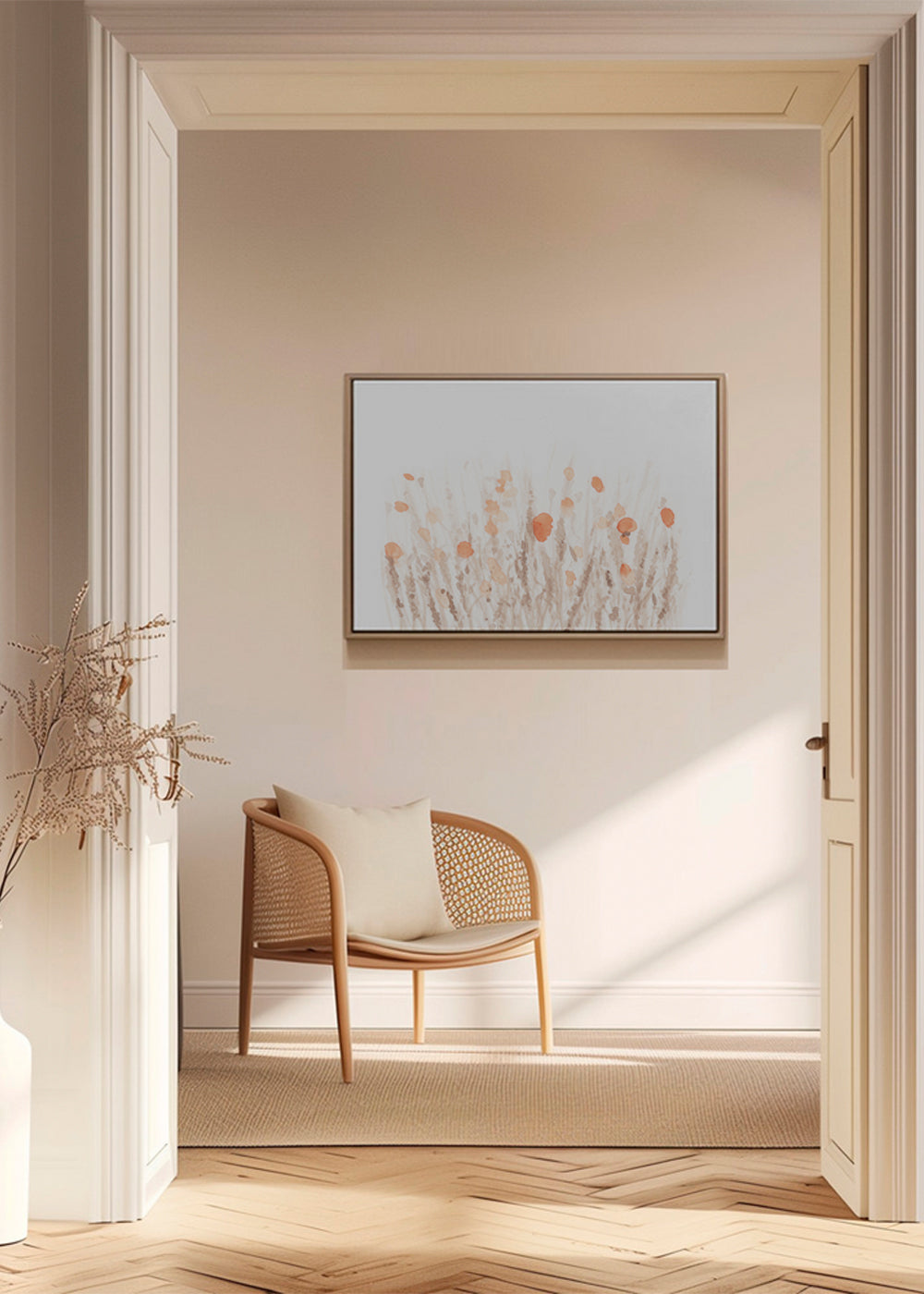 Une image de la collection tableaux de fleurs et botanique, de la collection de l'artiste Nouveau Prints, avec pigments orangés, et en format paysage. Le calme et la liberté transmis par les tableaux de paysages sont uniques. Transformez votre intérieur grâce à vos murs.