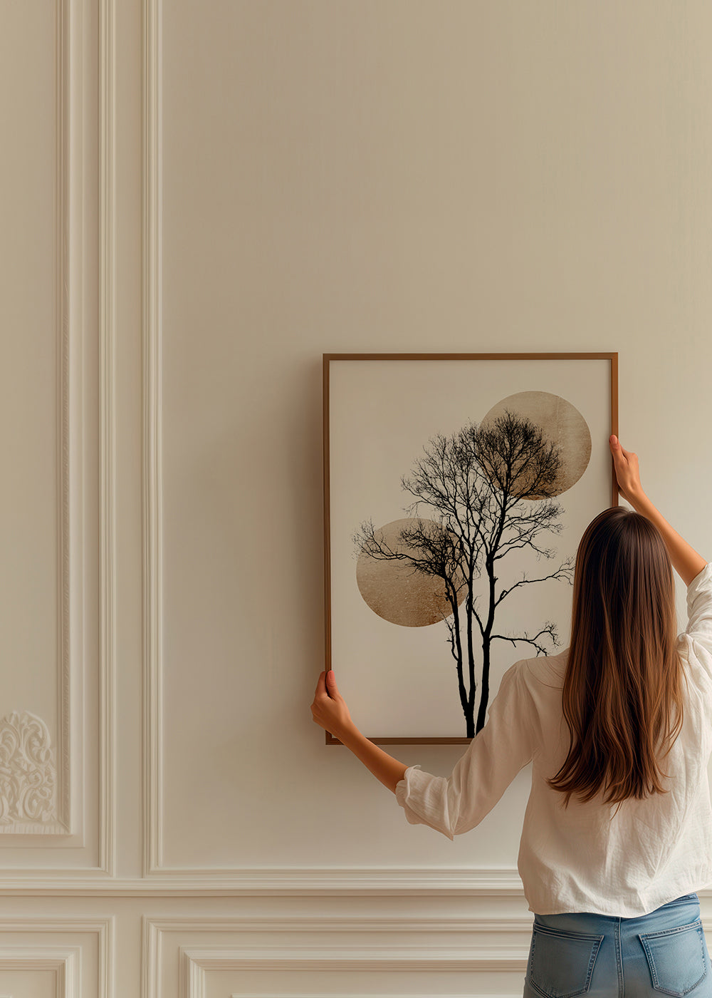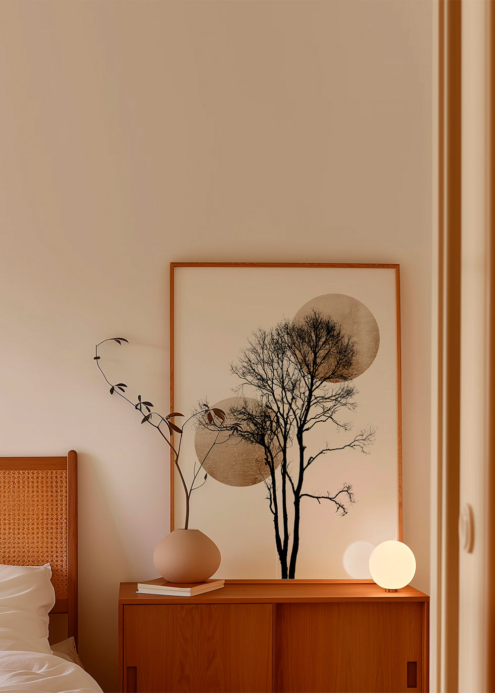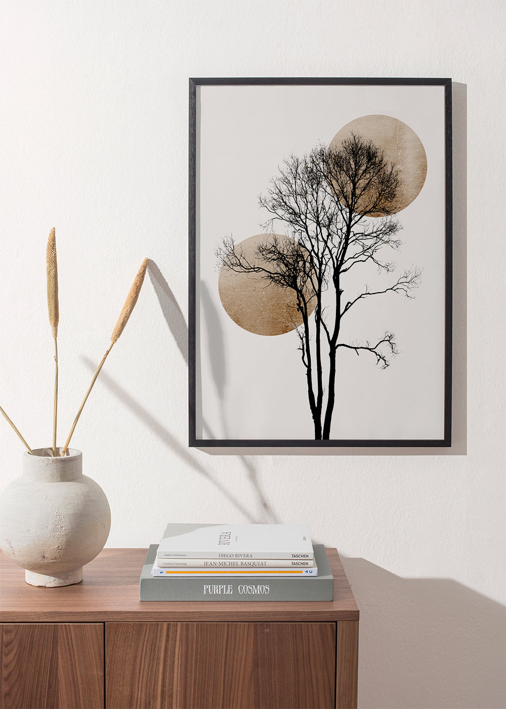Un affiche de notre collection affiches arbre, de Kubistika, dans des tons dorés, et en portrait. Le calme et la liberté transmis par les tableaux de paysages sont uniques. Le tableau dont ce mur a tant besoin.