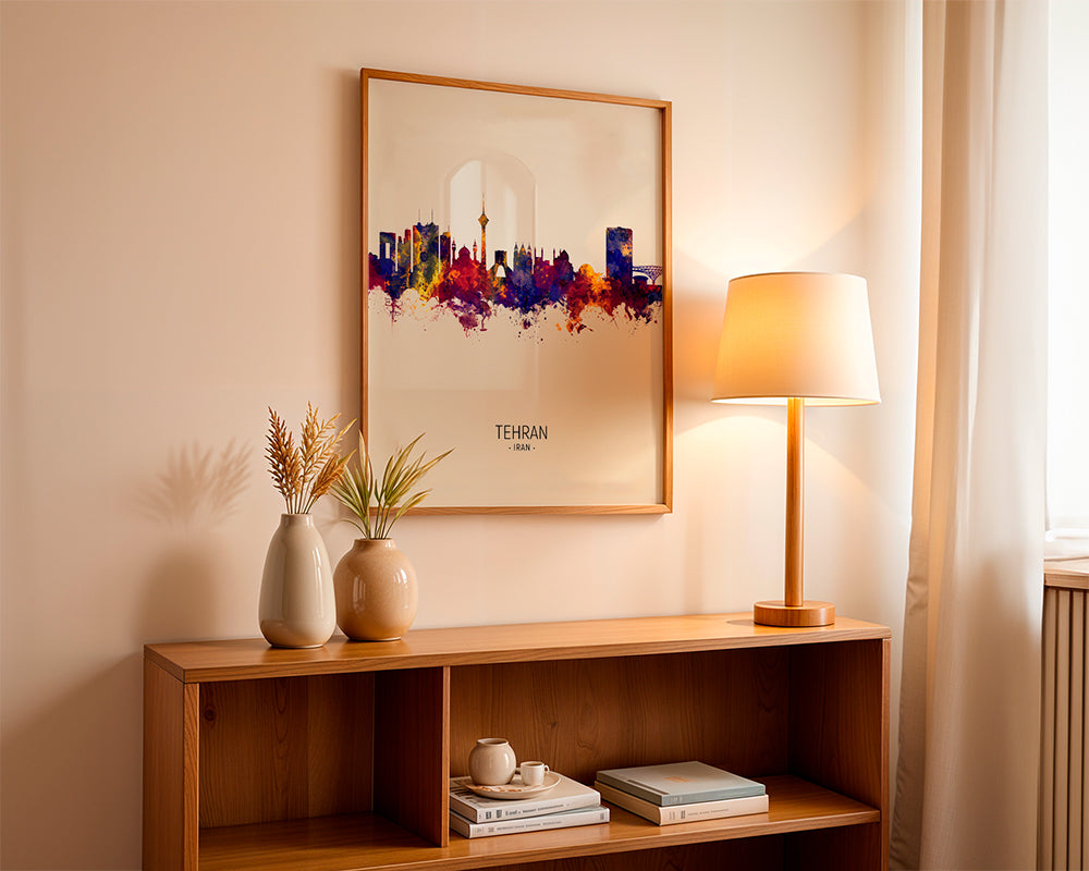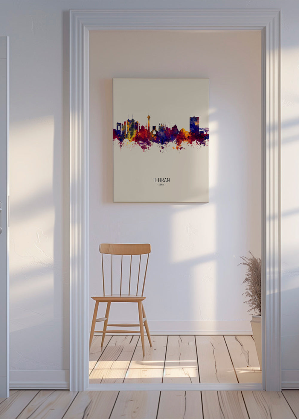 Beau poster du style de nos skyline posters, conçue par Michael Tompsett, avec des tonalités multicolores, et à mettre en portrait. Un tableau idéal pour les voyageurs invétérés. Combinez-les avec nos autres tableaux des cartes et villes . Le tableau dont ce mur a tant besoin.