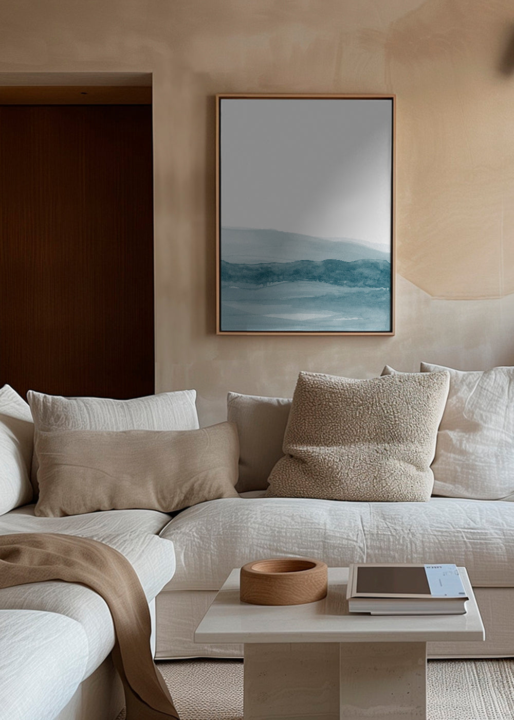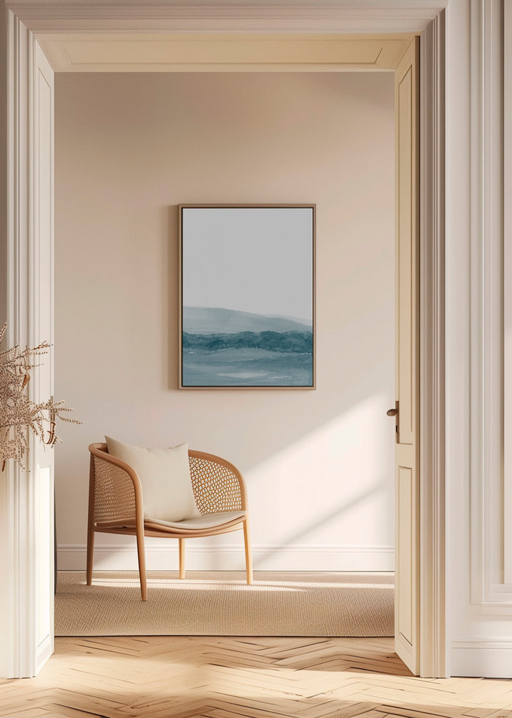 Une oeuvre de notre ensemble tableaux aux pinceaux, appartenant à la collection de Nouveau Prints, avec des touches bleus, et à mettre en portrait. La nature dans son plus bel écrin, les tableaux avec paysages transmettent beaucoup de calme. Élégance inspirée par l'art.
