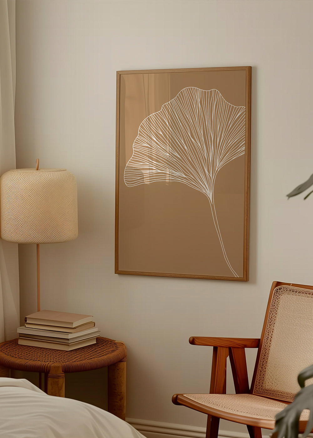 Une oeuvre de notre ensemble affiches feuille, original de Veronika Boulová, avec pigments bruns, et à mettre en portrait. C'est une illustration de style simple et propre, combinez-la avec d'autres illustrations pour obtenir une composition artistique. Une touche de modernité pour votre intérieur.