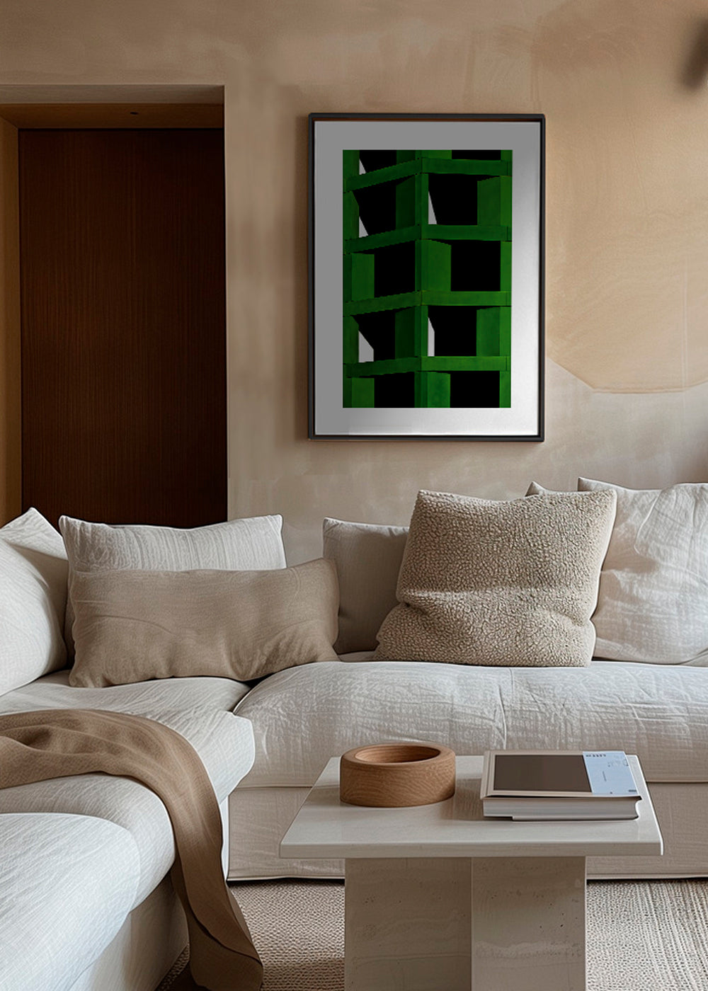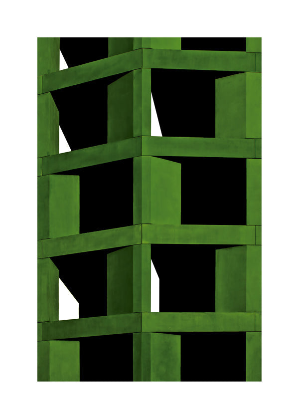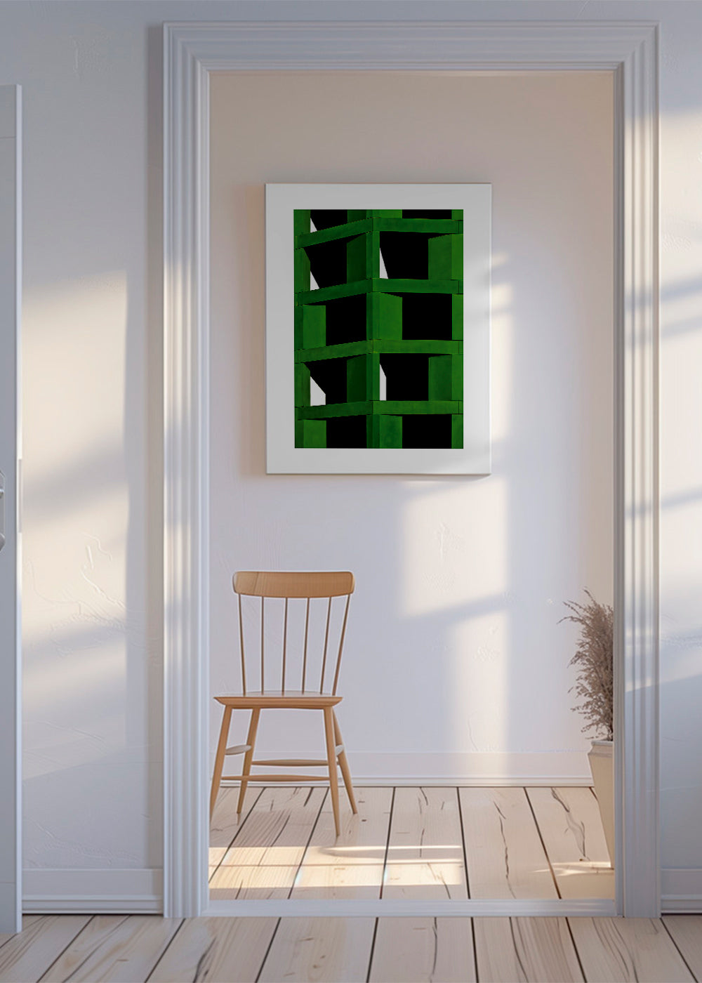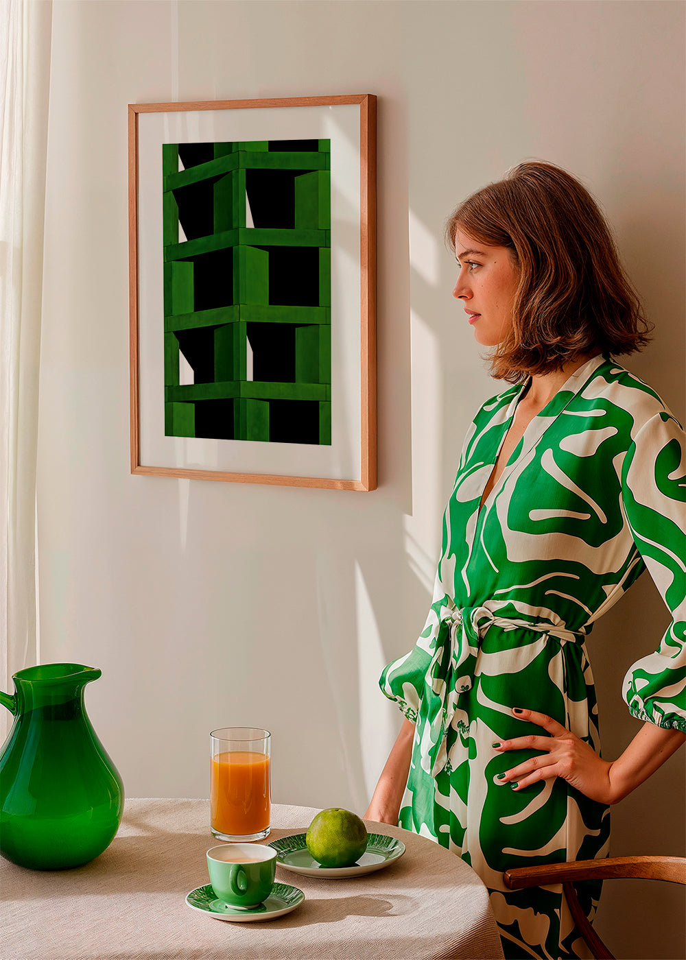 Une image de la collection tableaux d'architecture, avec des nuances de tons verts, et en portrait. Les formes géométriques et abstraites contribuent à créer une atmosphère légère et créative. Jouez avec les différentes combinaisons de nos œuvres pour obtenir le style que vous souhaitez. Ce modèle comprend une bordure blanche qui ajoute du contraste à l'œuvre.