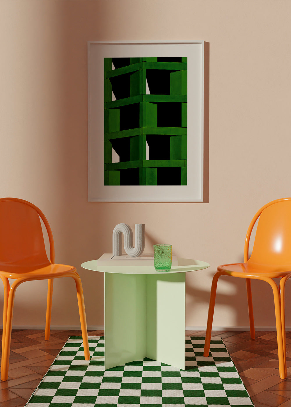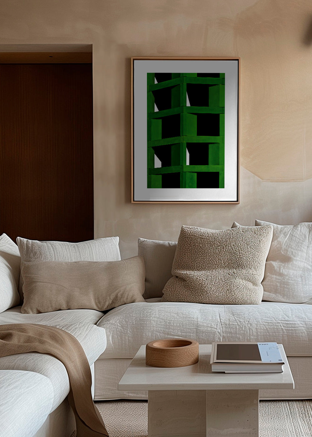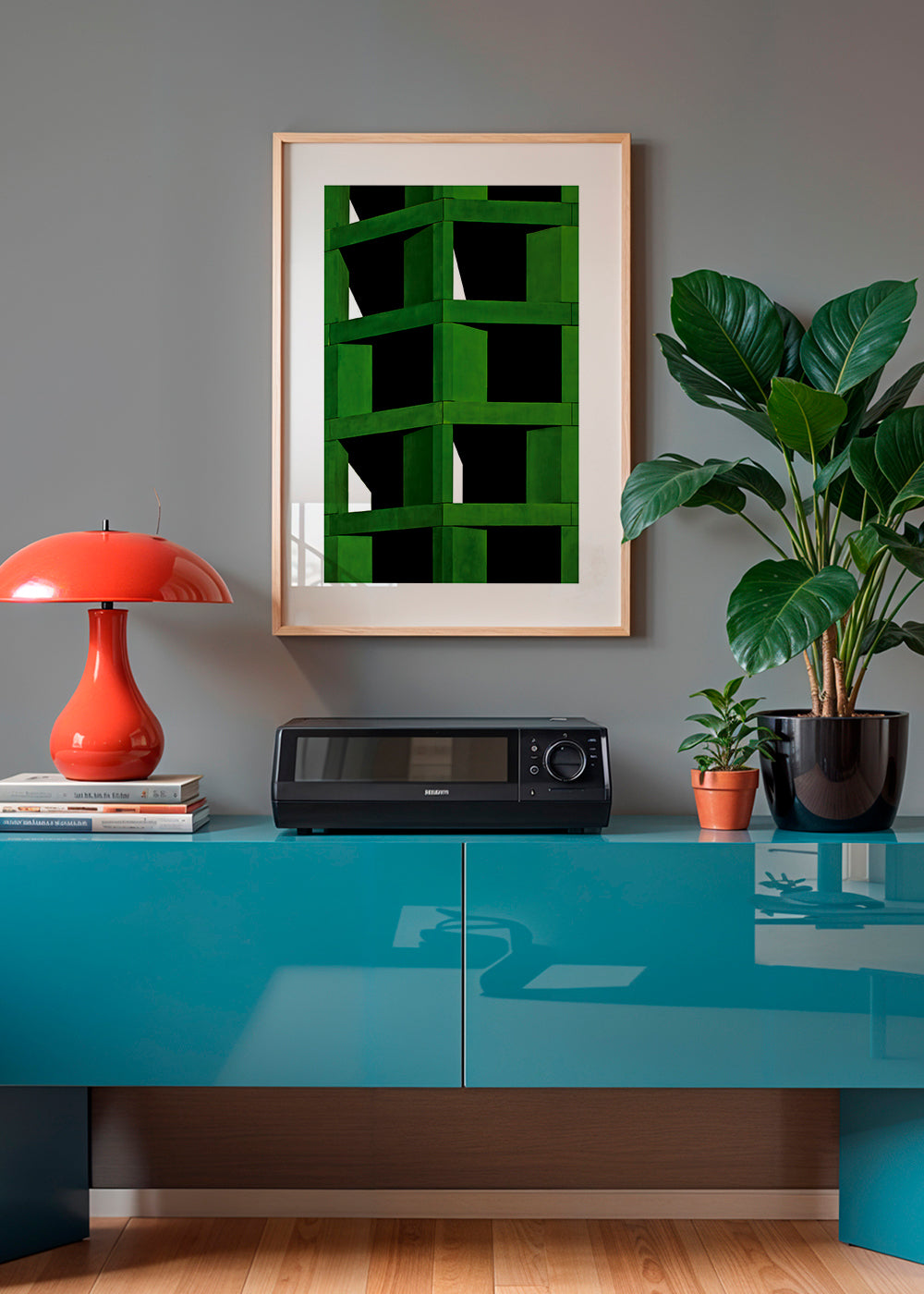 Une image de la collection tableaux d'architecture, avec des nuances de tons verts, et en portrait. Les formes géométriques et abstraites contribuent à créer une atmosphère légère et créative. Jouez avec les différentes combinaisons de nos œuvres pour obtenir le style que vous souhaitez. Ce modèle comprend une bordure blanche qui ajoute du contraste à l'œuvre.