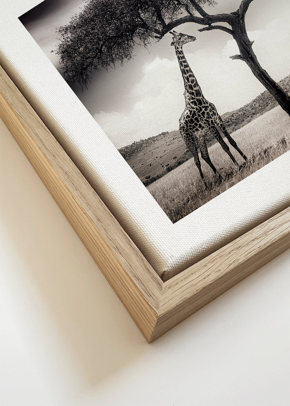 Si vous sélectionnez l'option passe-partout, nous ajouterons le tableau blanc mat au cadre, et nous réduirons le dessin de l'œuvre. Par exemple, si vous sélectionnez un tirage au format 50x70 cm, avec un cadre et un passe-partout couleur chêne, nous réduirons le dessin du tirage au format précédent (40x50cm). Ainsi, il s'adaptera parfaitement à la fenêtre intérieure du passe-partout.