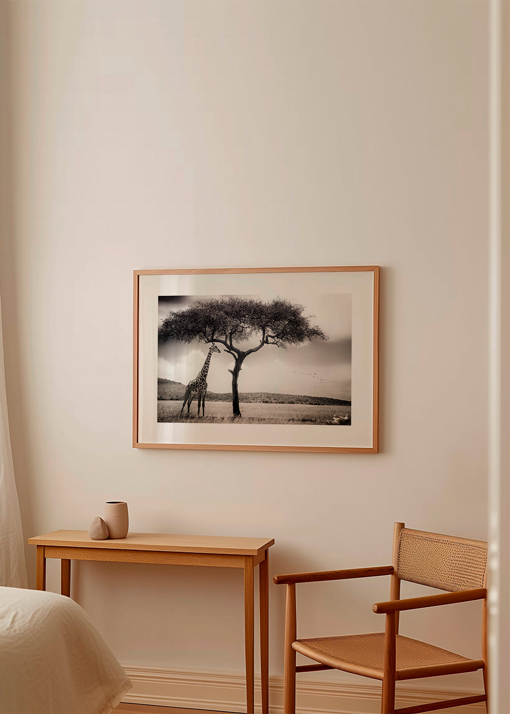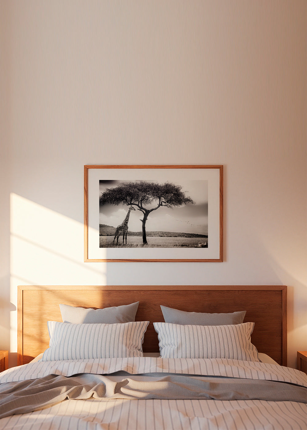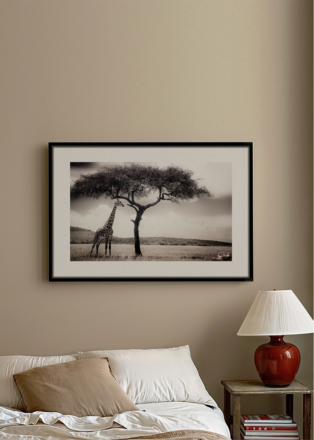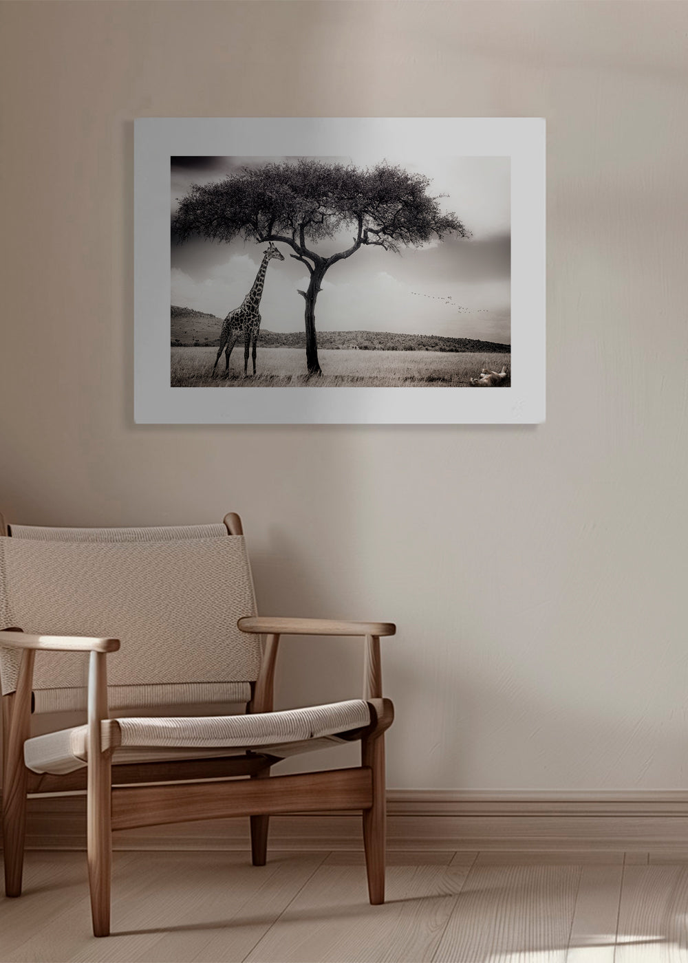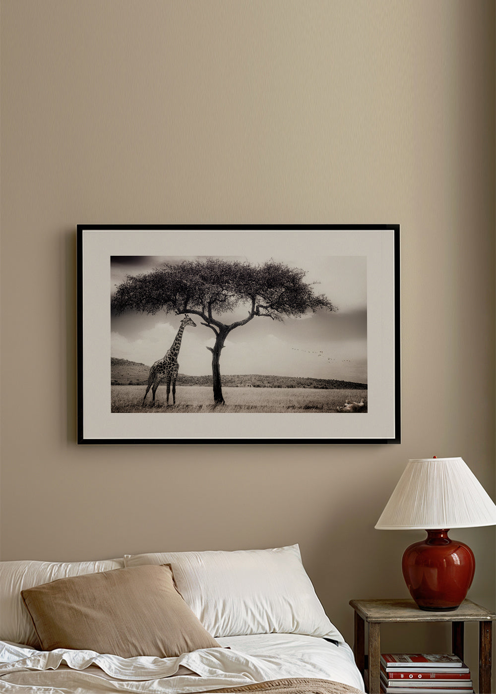 Un tableau de la série tableaux d'animaux, en couleurs noirs, et dans une orientation format paysage. Le calme et la liberté transmis par les tableaux de paysages sont uniques. Choisissez la taille qui correspond le mieux à votre intérieur. Ce modèle comprend une bordure blanche qui ajoute du contraste à l'œuvre.