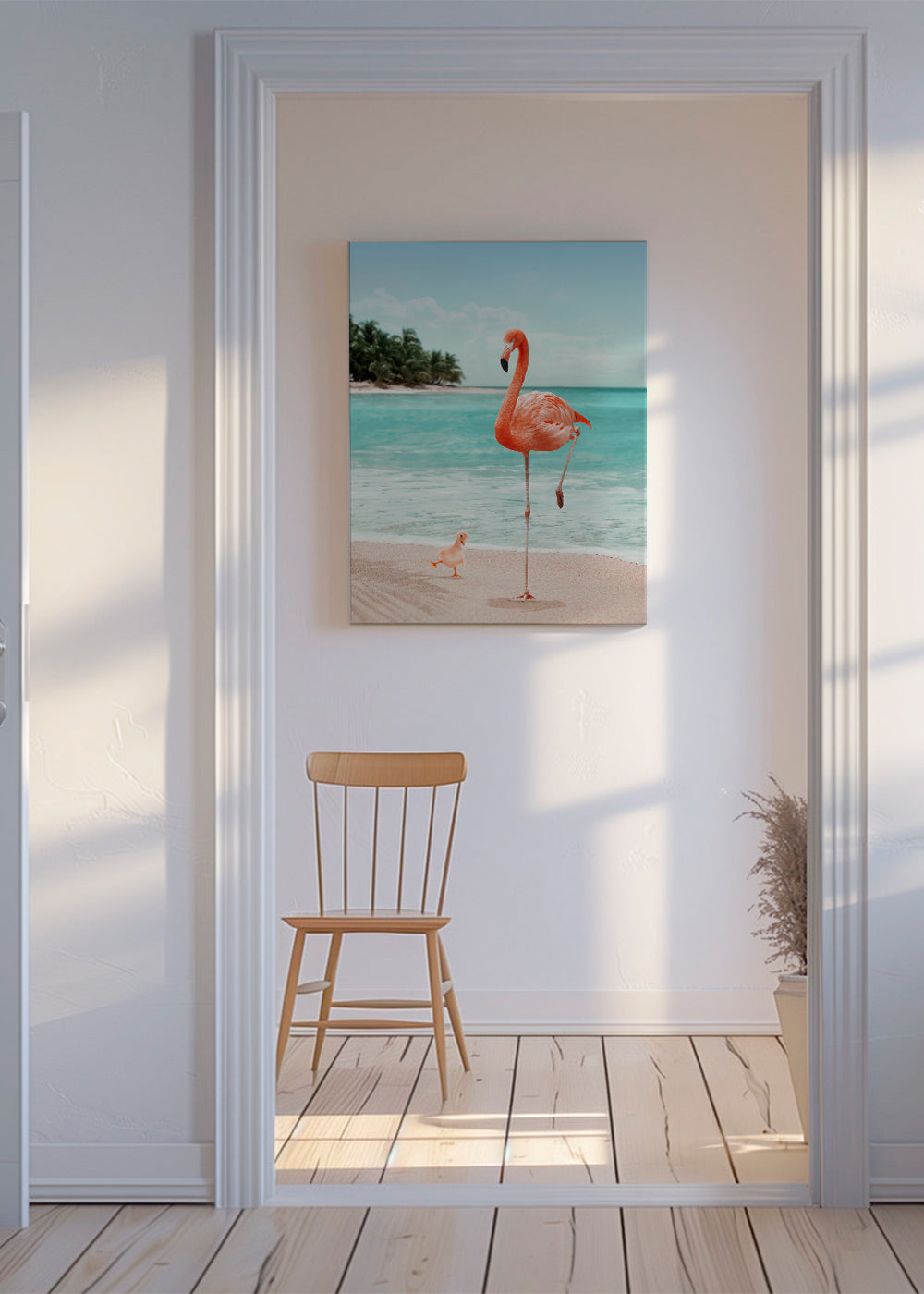 Une plaque du style de nos tableaux flamant rose, de l'artiste Jonas Loose, avec des touches bleus, et pour mettre en orientation portrait. Décorer avec des tableaux d'animaux est un moyen de transmettre de l'énergie grâce à vos murs. Transformez votre intérieur grâce à vos murs.